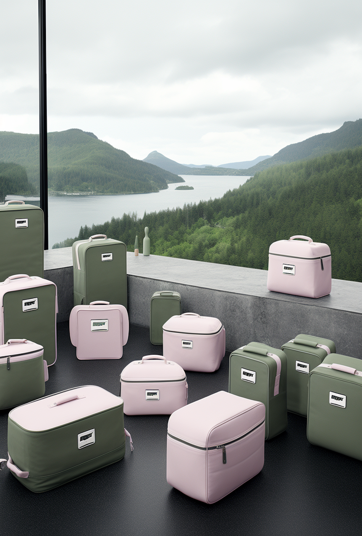 Stylish pink and green luggage set against a serene lake and lush hills, offering a modern and minimalist travel vibe.