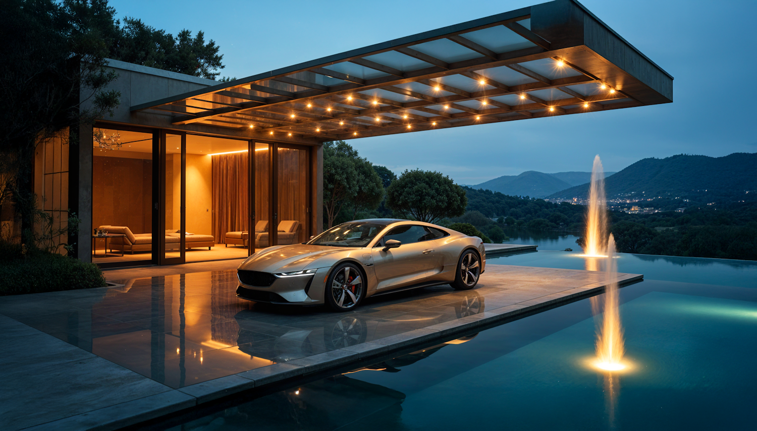 Luxurious silver sports car parked by a modern house with an infinity pool and fountains, set against a serene evening landscape.