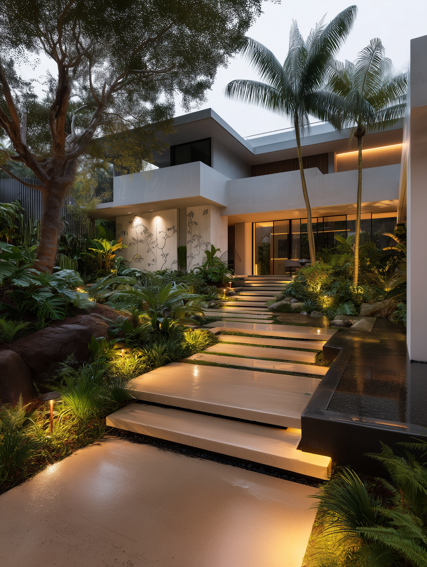 Modern luxury home with tropical landscaping, floating steps, and warm lighting creating a serene and inviting atmosphere.