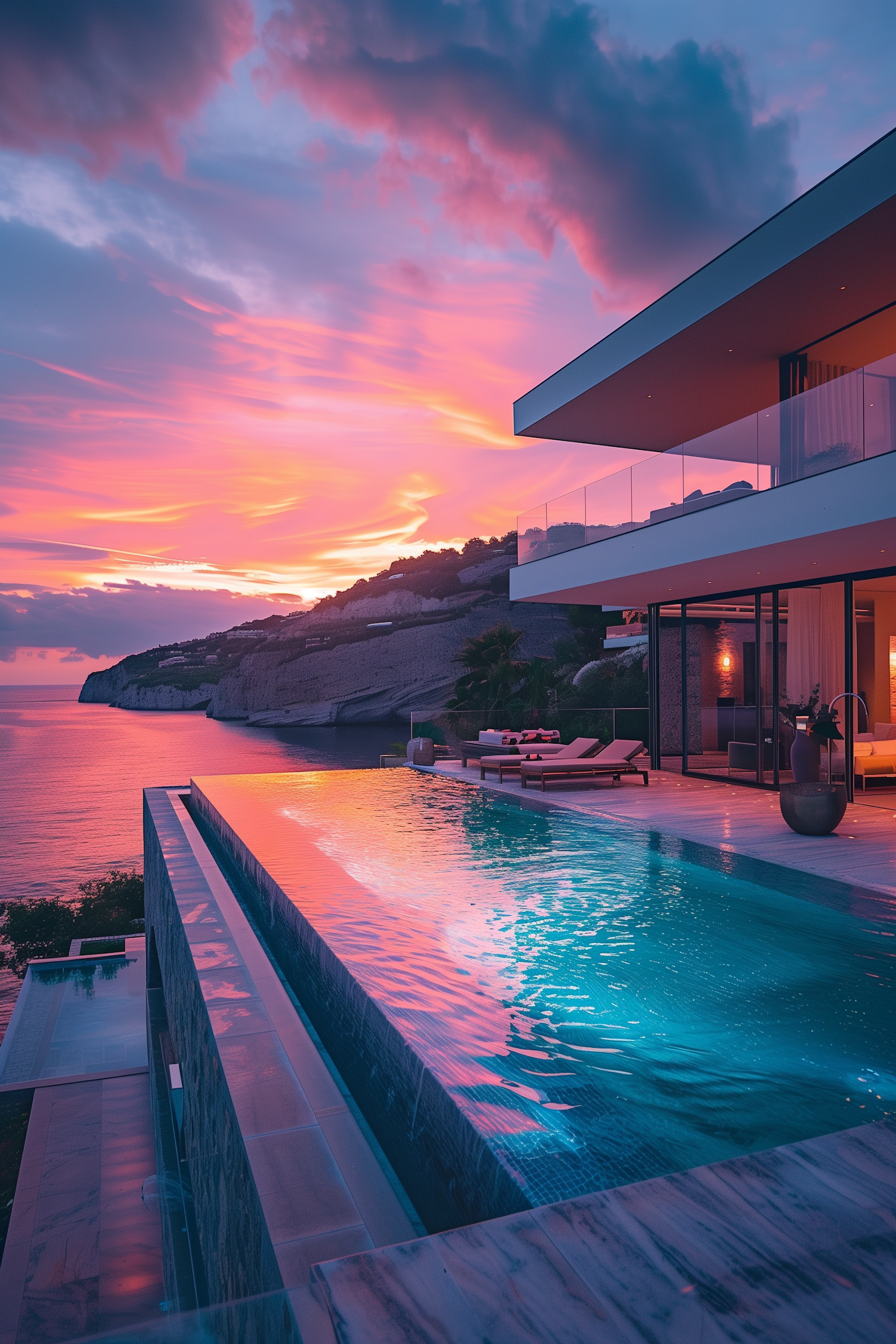 Luxurious villa with infinity pool overlooking ocean at sunset, vibrant sky colors, modern architecture, and serene ambiance.