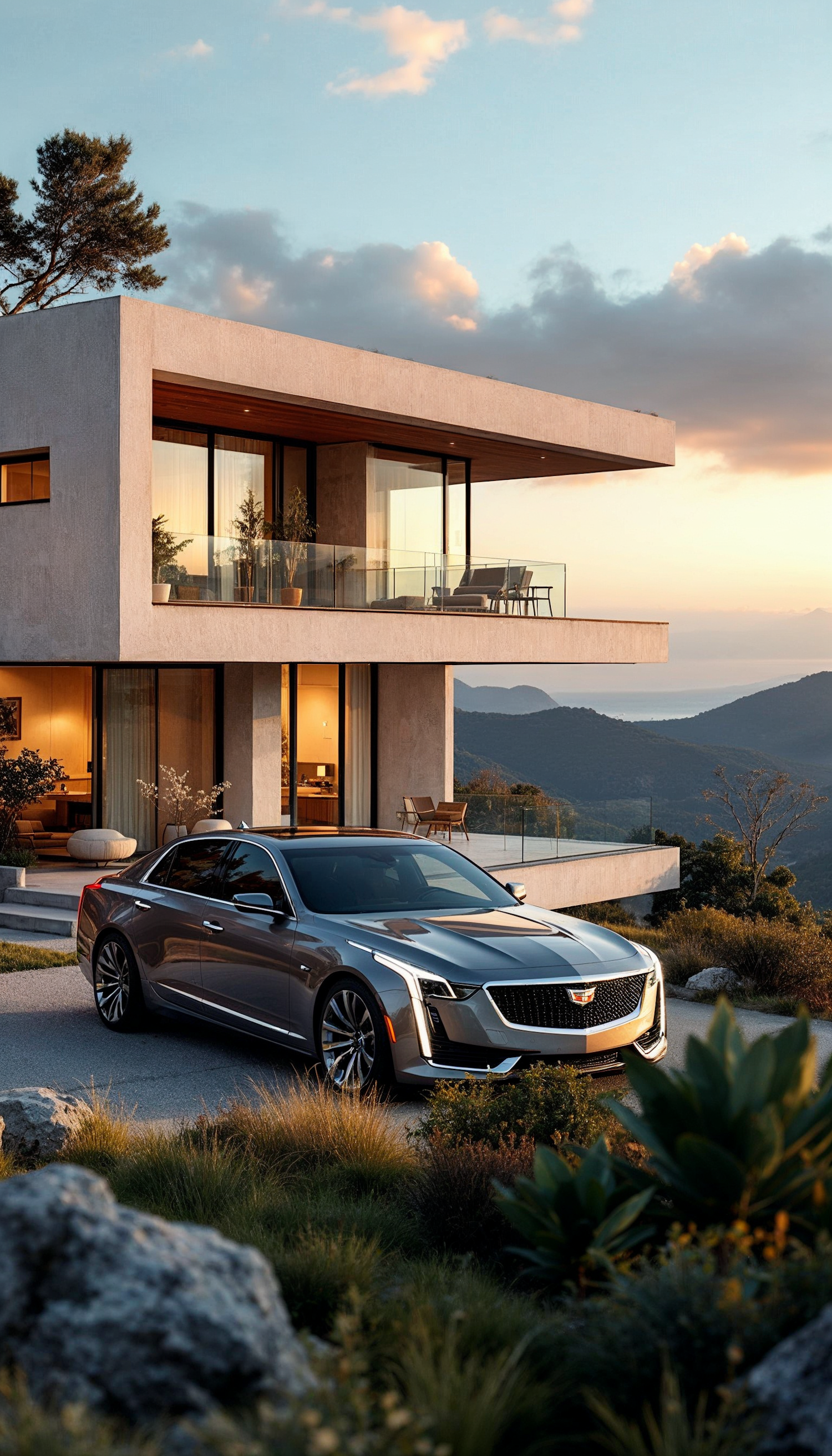 Modern house with glass windows and a luxury car in a scenic landscape at sunset, blending contemporary design with natural beauty.