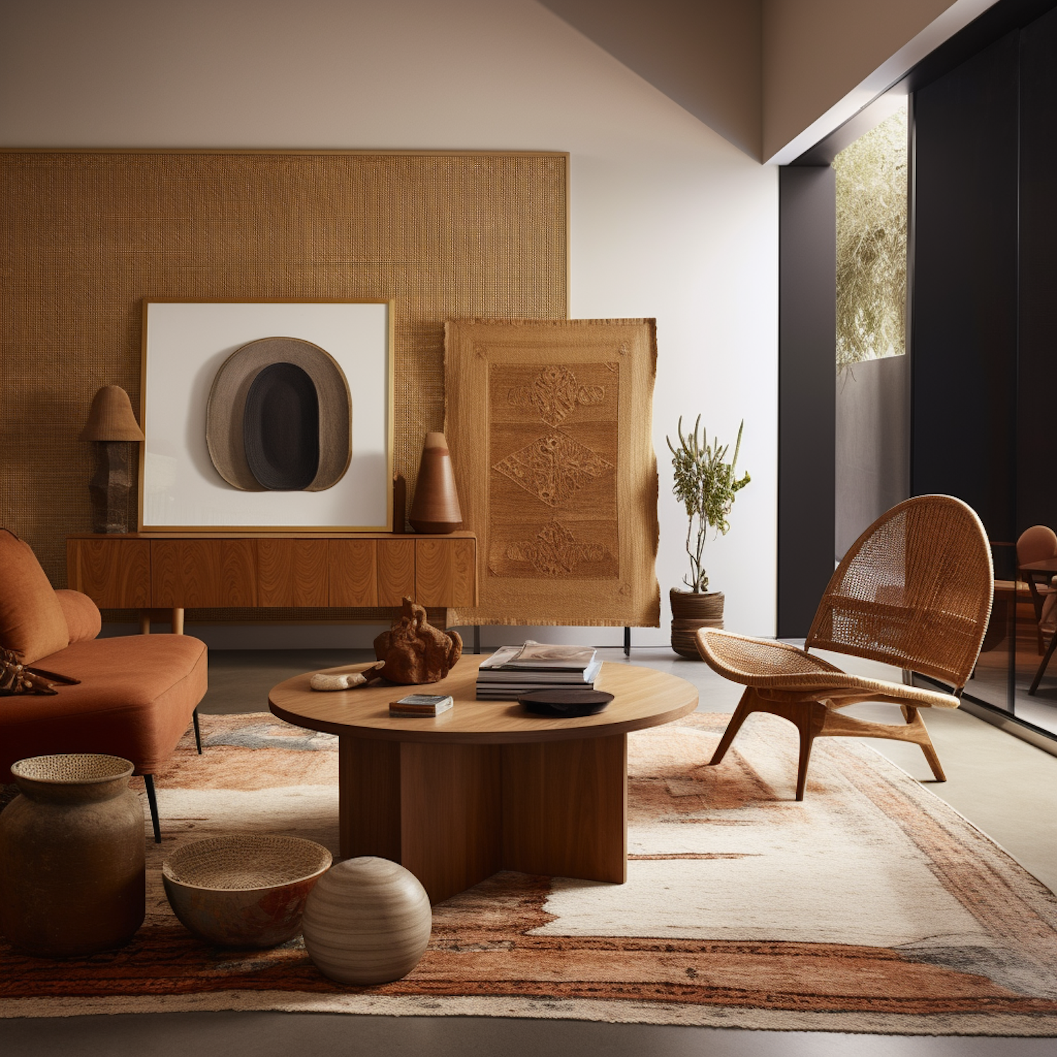 Modern living room with earthy tones, featuring a wooden coffee table, orange sofa, abstract art, and woven chair for a cozy ambiance.