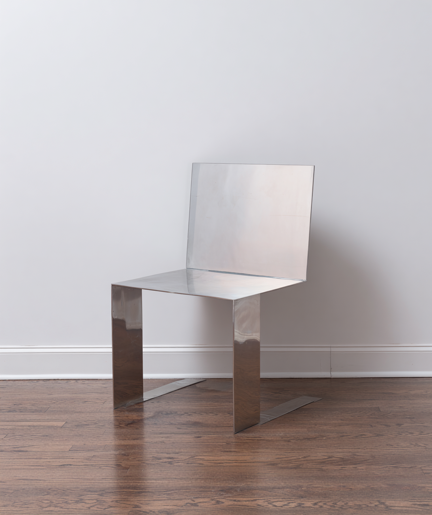 Minimalist polished metal chair with angular design on a wooden floor, perfect for modern interiors.
