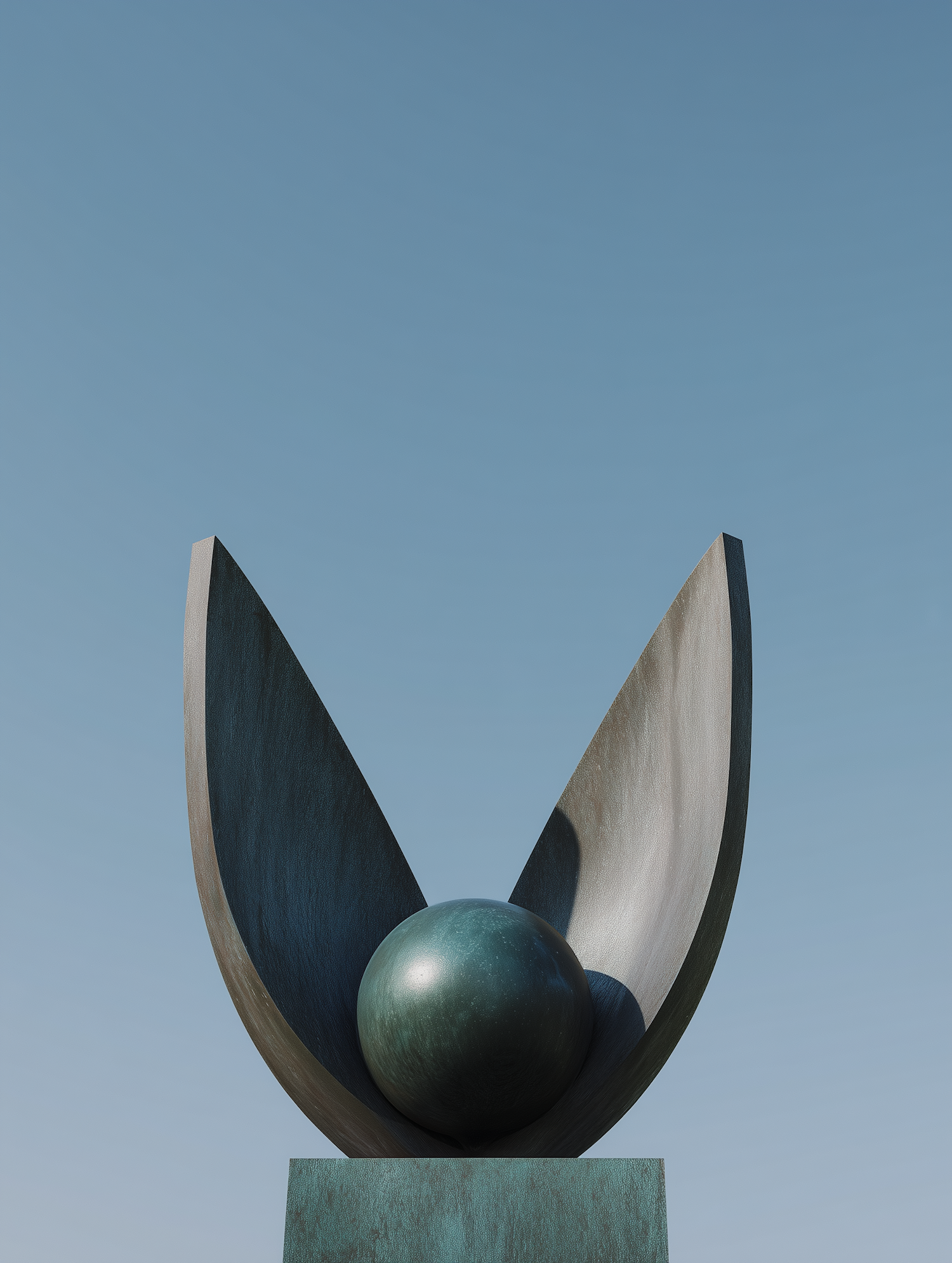 A modern sculpture with a spherical centerpiece cradled by curved wings, set against a clear blue sky, showcasing minimalist design.