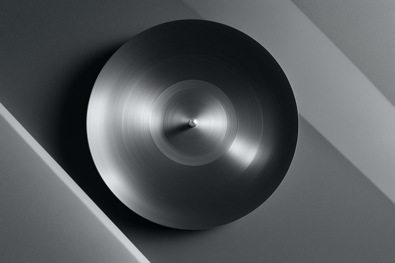 A sleek metallic circular object with a brushed finish on a textured, monochromatic background, showcasing modern industrial design.