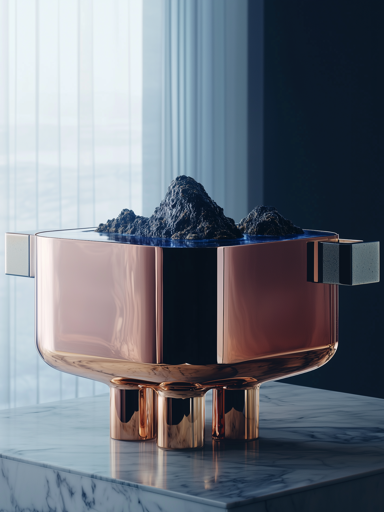 Modern sculpture with copper base and textured mound on marble surface, set against a softly lit background with sheer curtains.