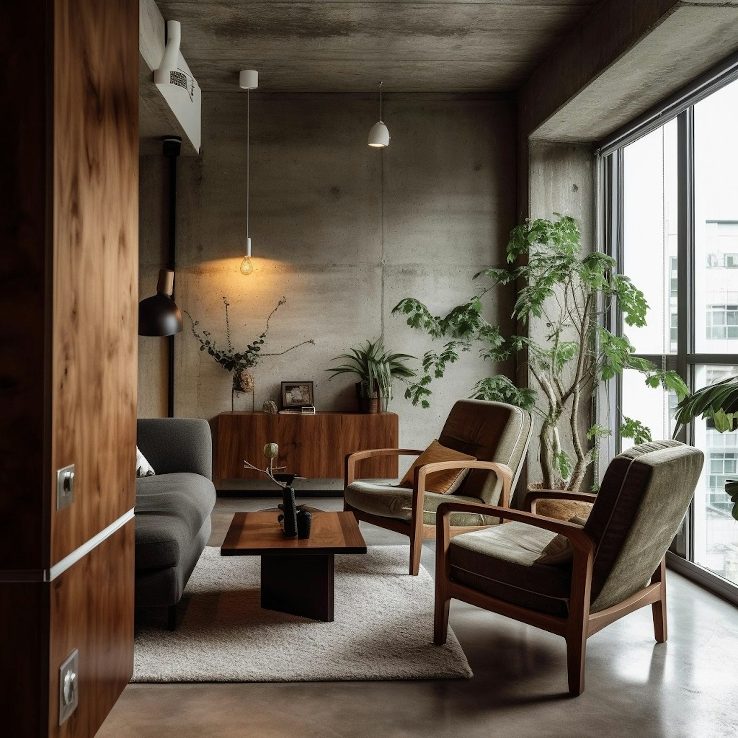 Modern living room with concrete walls, wooden furniture, and lush plants. Soft lighting and large windows create a cozy, airy space.