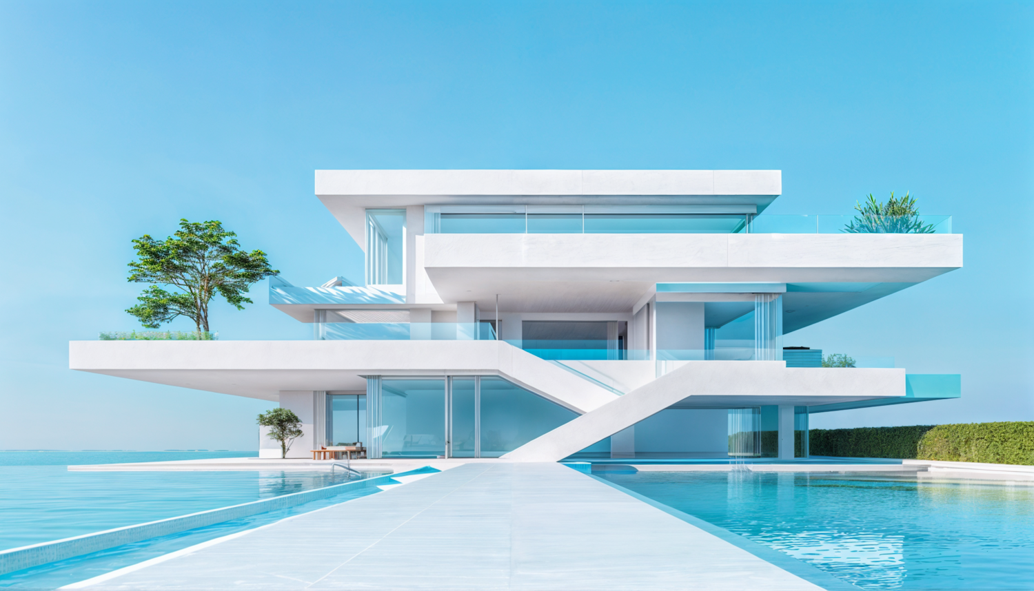 Modern minimalist house with sleek white design, glass windows, and a large pool, set against a clear blue sky.