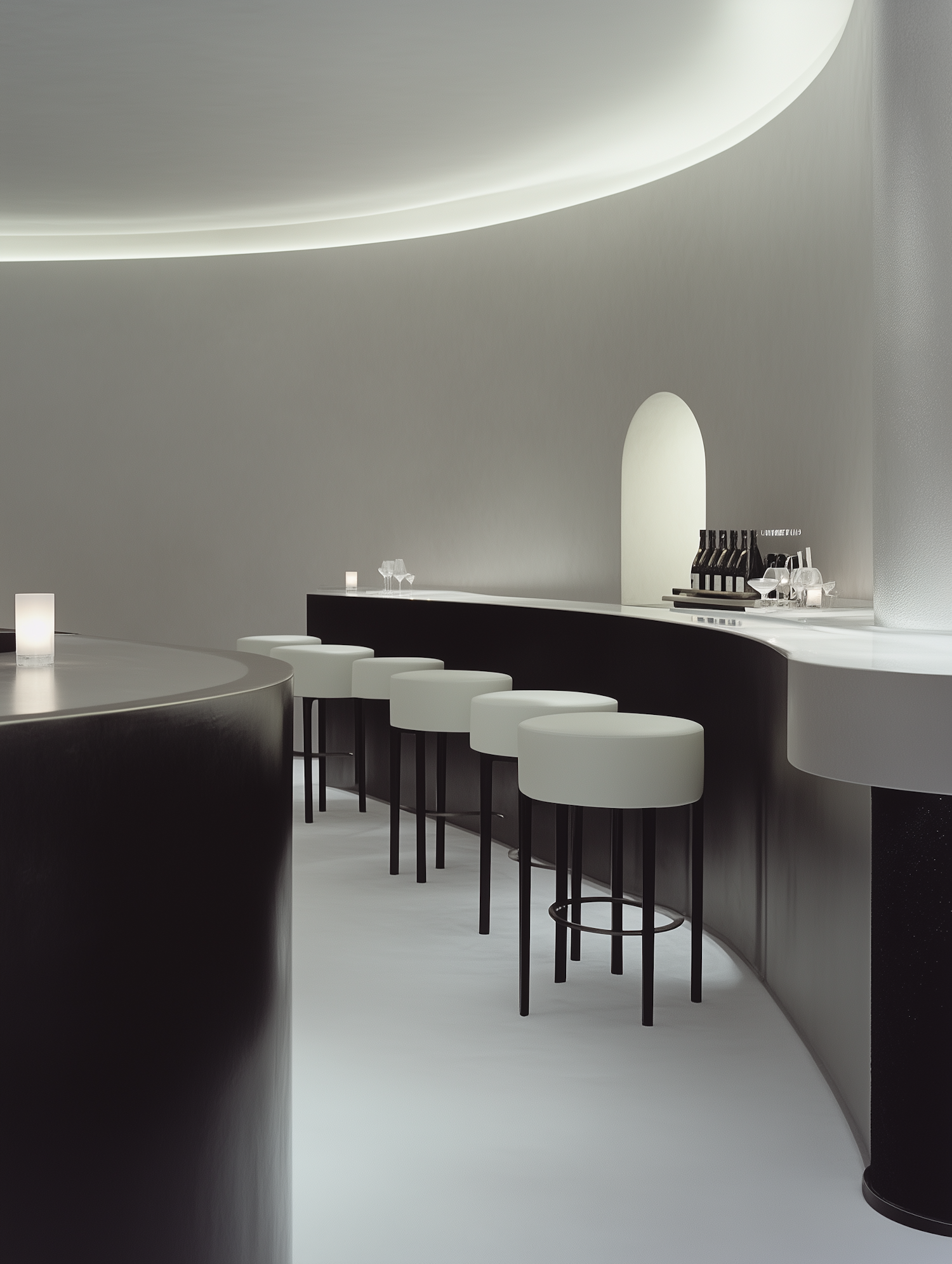 Minimalist bar interior with sleek black and white design, curved counter, and ambient lighting. Elegant wine display adds sophistication.