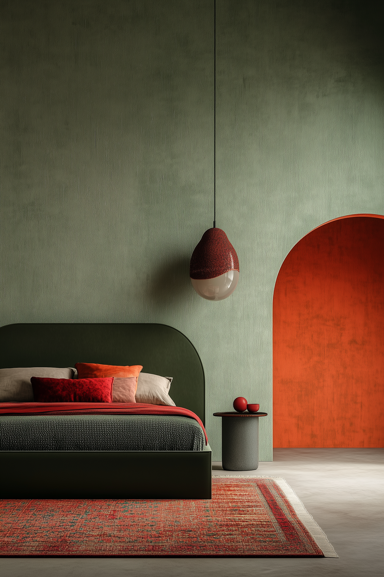 Modern bedroom with green walls, orange accents, and red bedding. Features a unique pendant light and a textured red area rug.