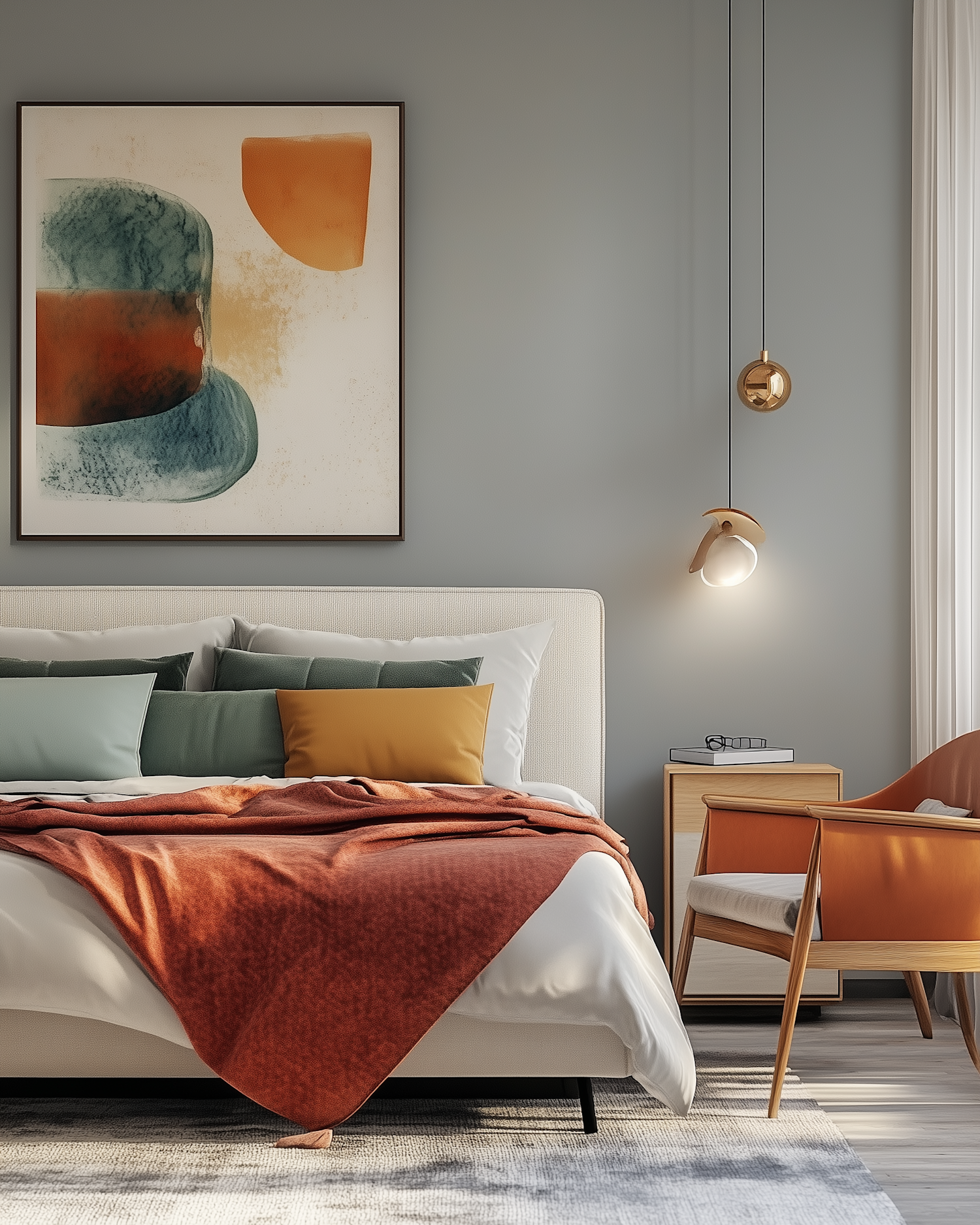 Modern bedroom with abstract art, rust accents, and mid-century furniture. Soft gray-blue walls and warm lighting create a cozy vibe.