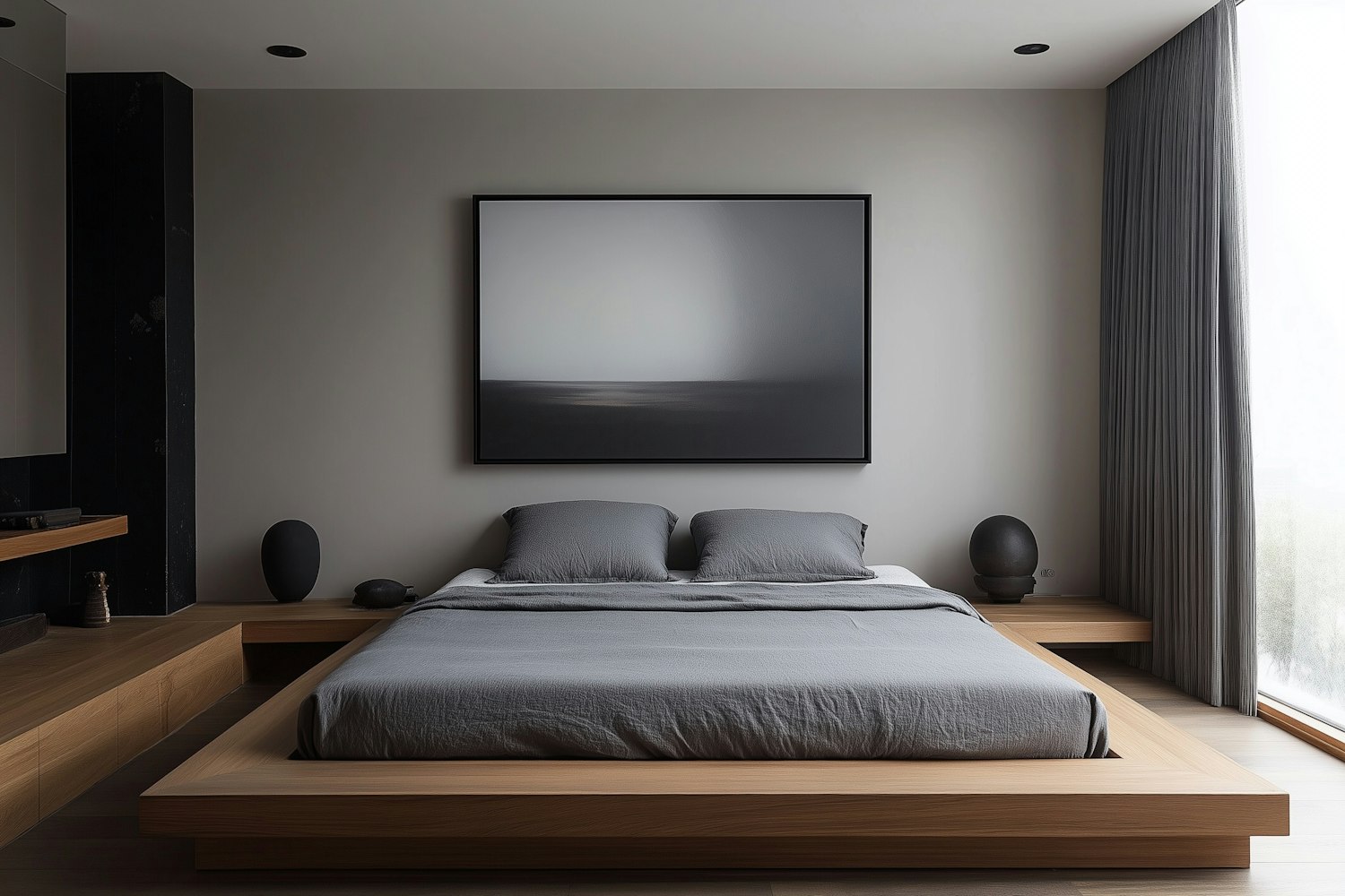Minimalist bedroom with a wooden platform bed, gray bedding, abstract wall art, and soft natural light filtering through gray curtains.