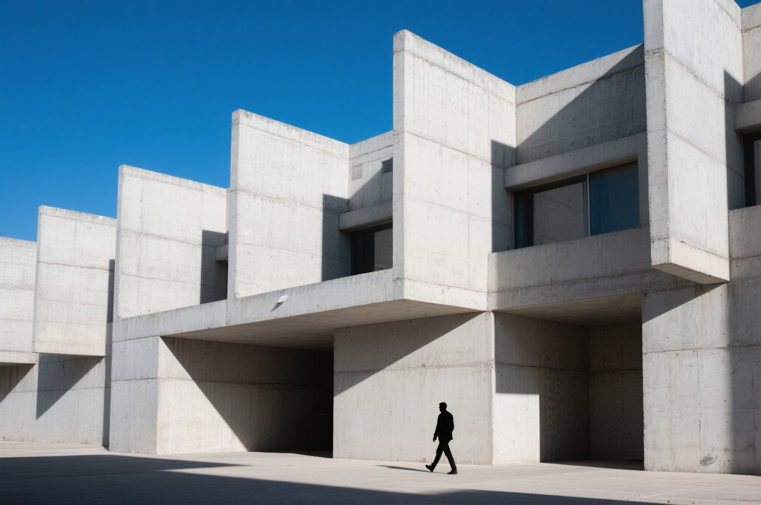 Minimalist brutalist façade, sharp shadows from midday sun, lone figure passing in the distance.
