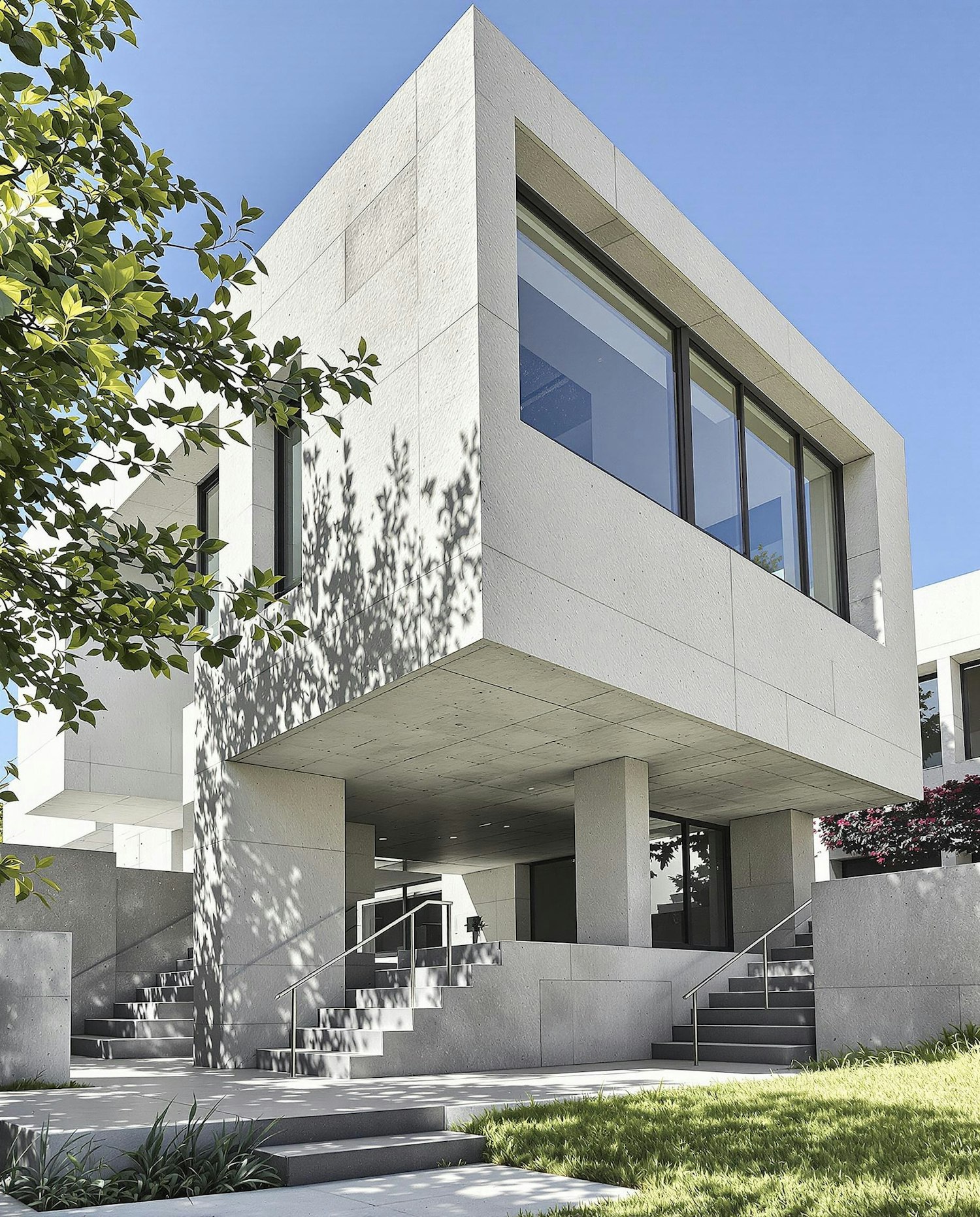 Modern minimalist concrete building with large windows, sleek stairs, and lush greenery under a bright blue sky.