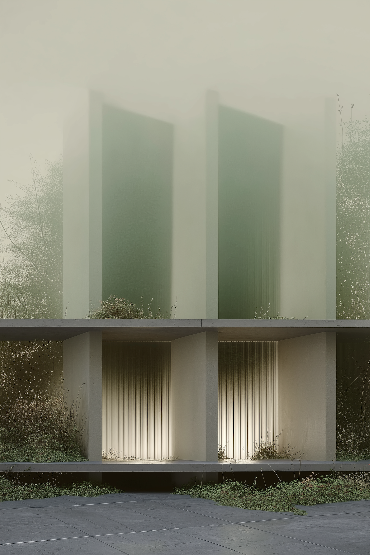 A minimalist architectural structure with soft lighting, surrounded by mist and overgrown vegetation, creating a serene atmosphere.