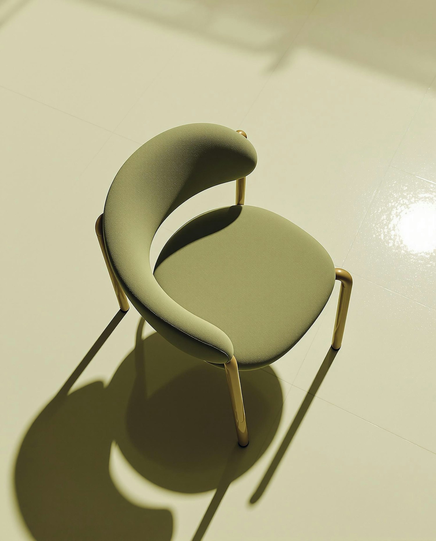 studio product photo, soft directional lighting with defined shadows, clean modern background with soft green tones, sculptural composition, high-end editorial aesthetic, sharp focus, minimal-maximal direction top-down angled view of a contemporary chair with four thick tubular legs, deep rounded seat, and a one-piece back and armrest design, upholstered in matte olive green fabric, casting long shadows on a glossy floor