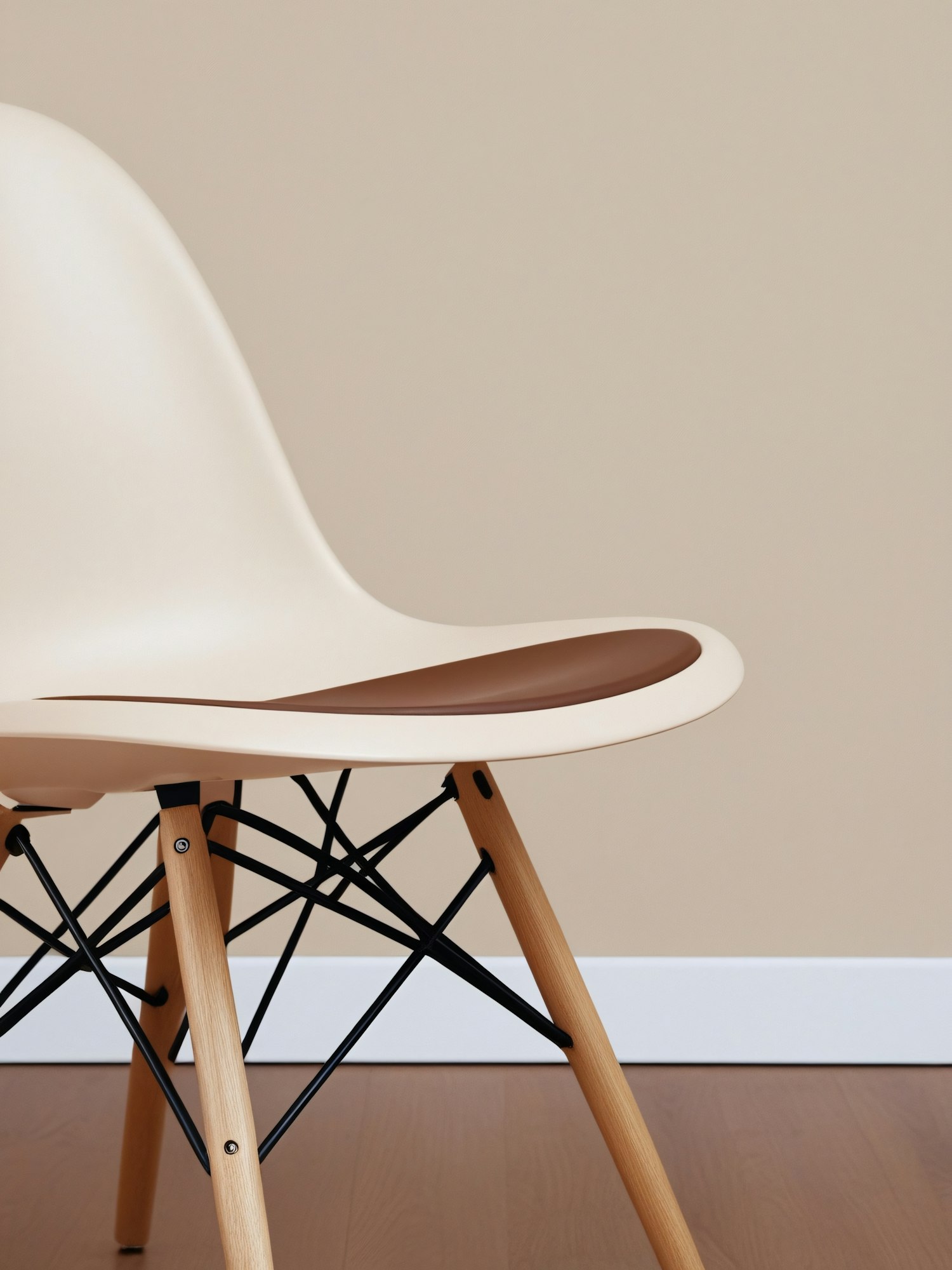 Modern chair with cream seat, brown cushion, and wooden legs with black metal supports against a beige wall and wooden floor.