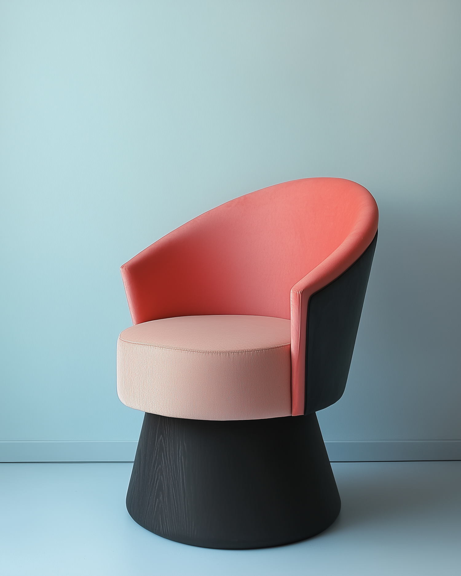 Modern coral pink and beige chair with a black cone-shaped base, set against a light blue background. Sleek and minimalist design.