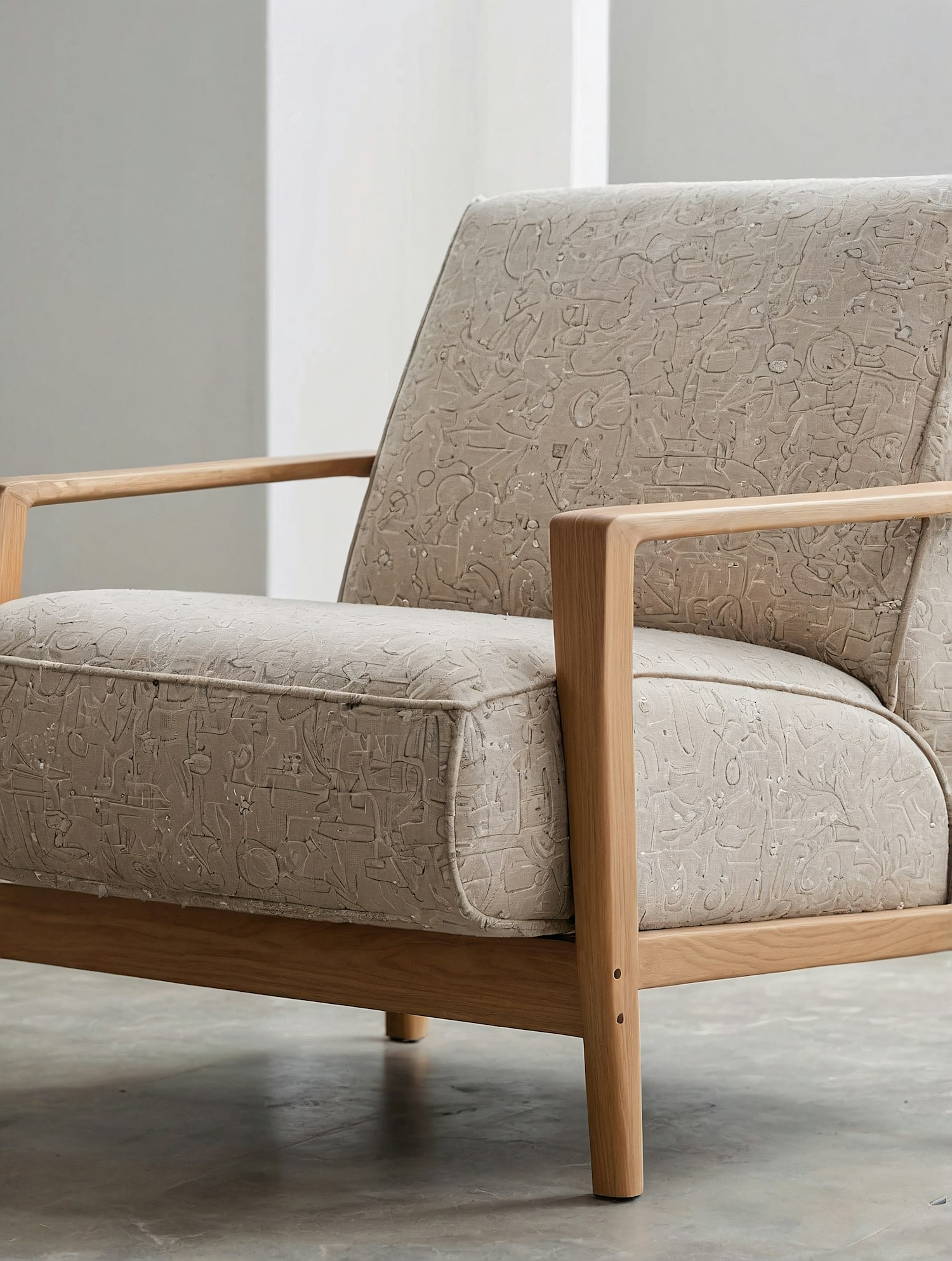 Modern beige armchair with embossed fabric and light wood frame, perfect for minimalist interiors. Stylish and functional design.