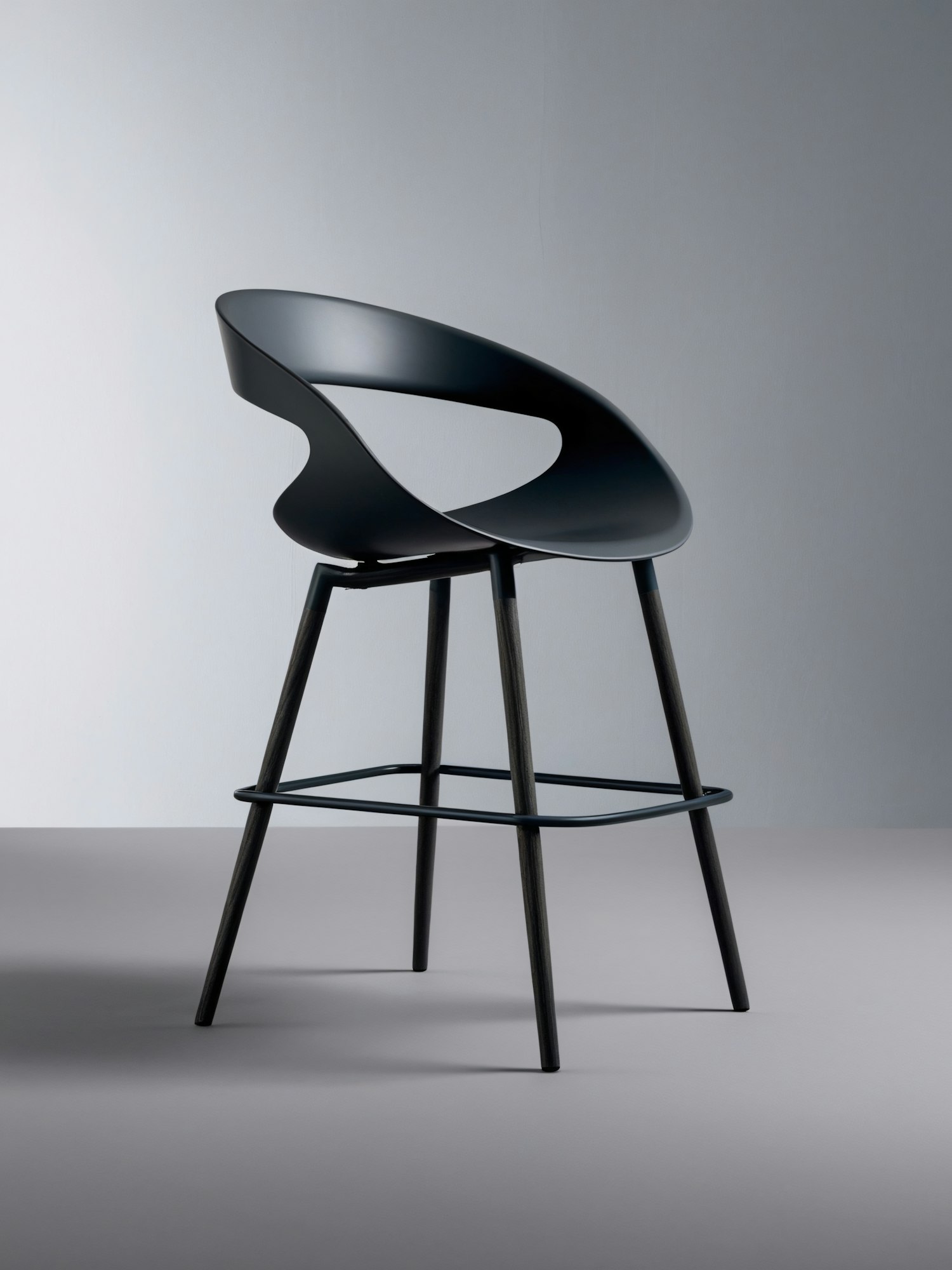 Sleek black bar stool with a curved backrest and minimalist design, perfect for modern interiors.