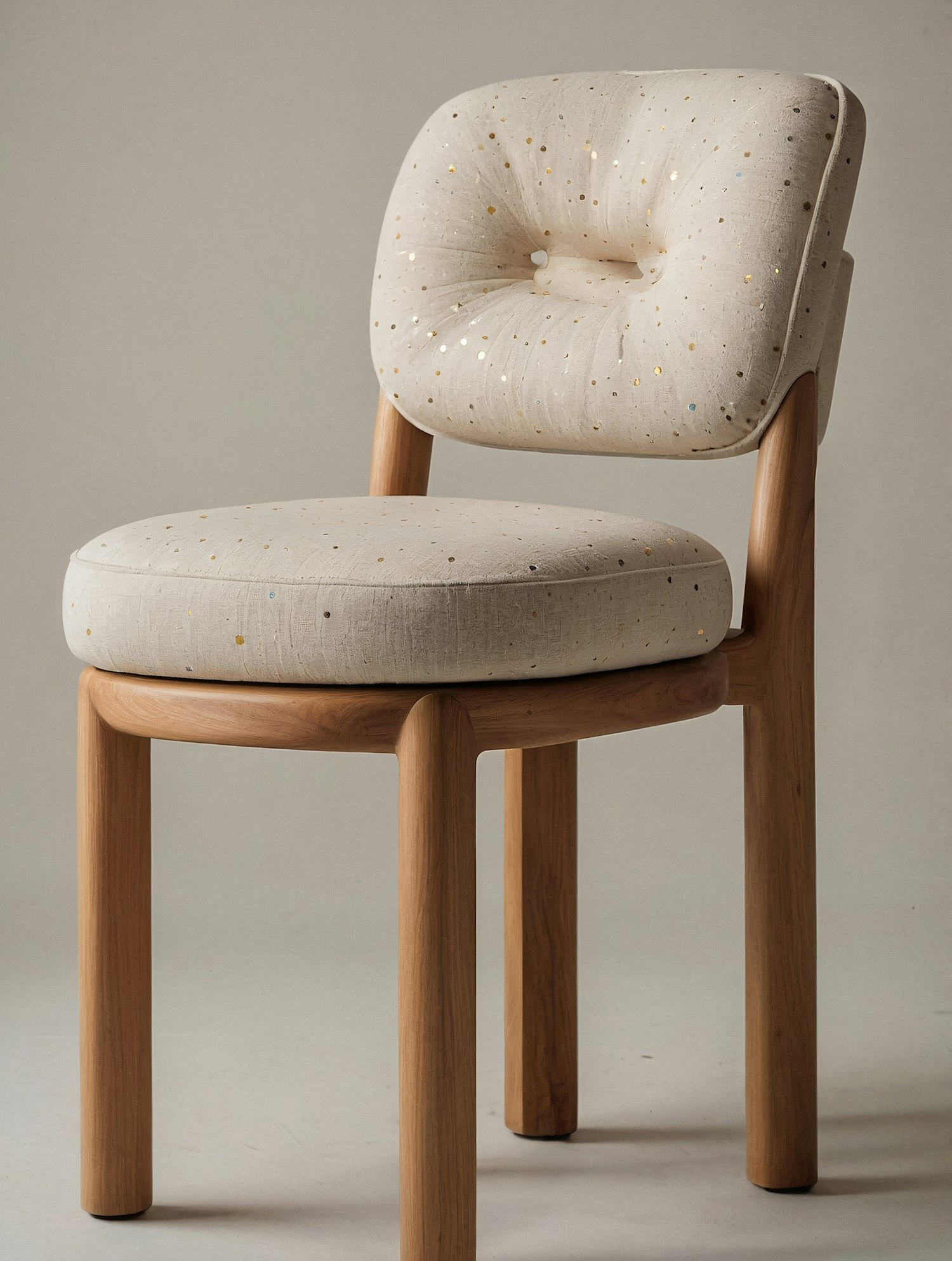 Elegant beige chair with gold-speckled upholstery, tufted backrest, and smooth wooden frame. Perfect for modern or minimalist interiors.
