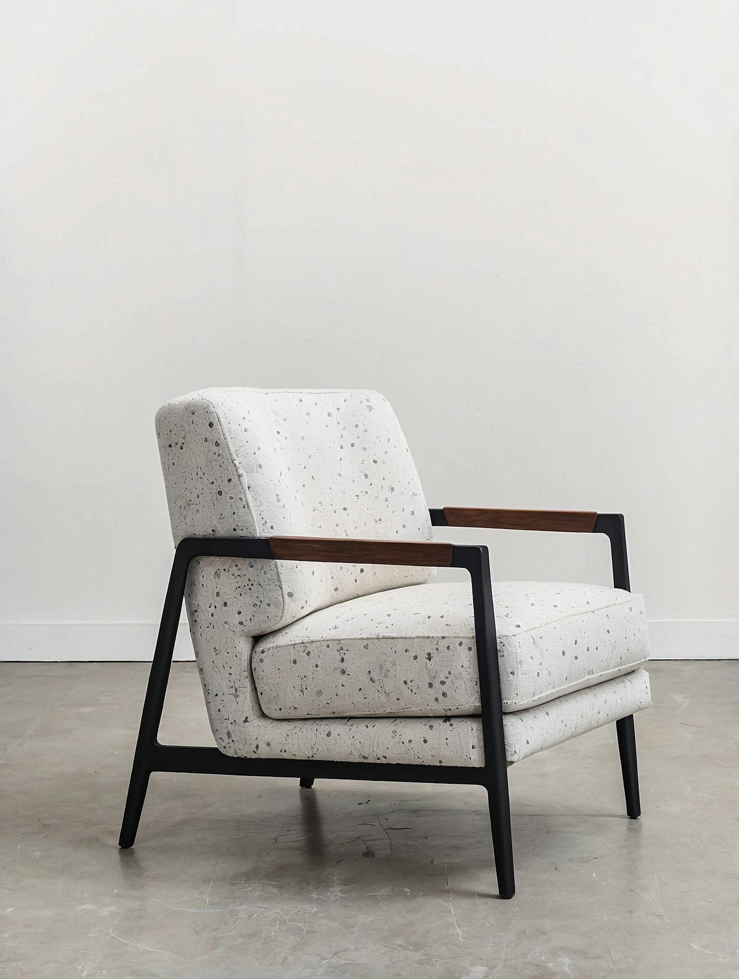 Modern speckled white armchair with black metal frame and wooden armrests, set against a minimalist white wall and concrete floor.