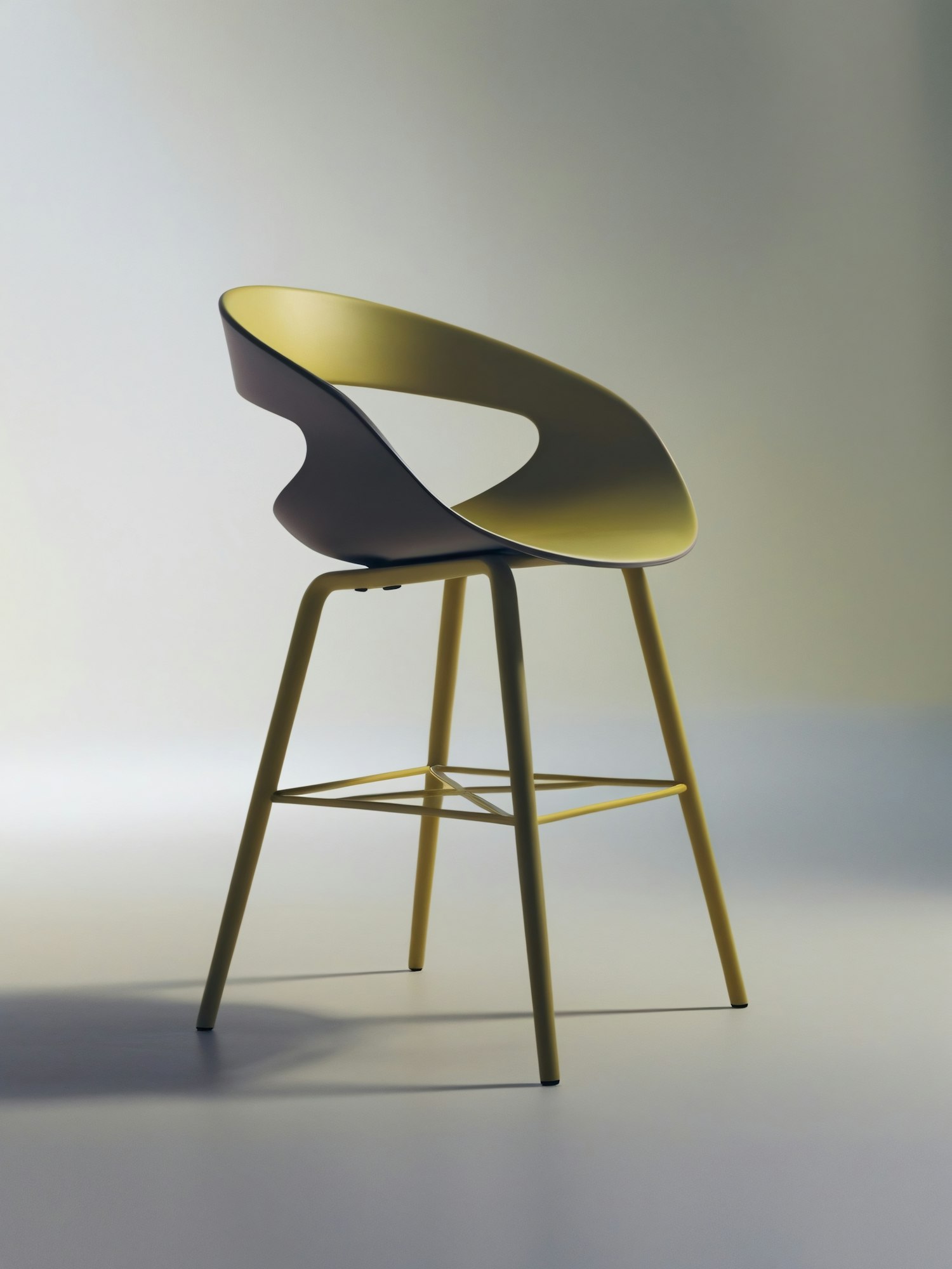 Sleek modern chair with a curved backrest and yellow finish, perfect for contemporary interiors. Minimalist design with geometric support.