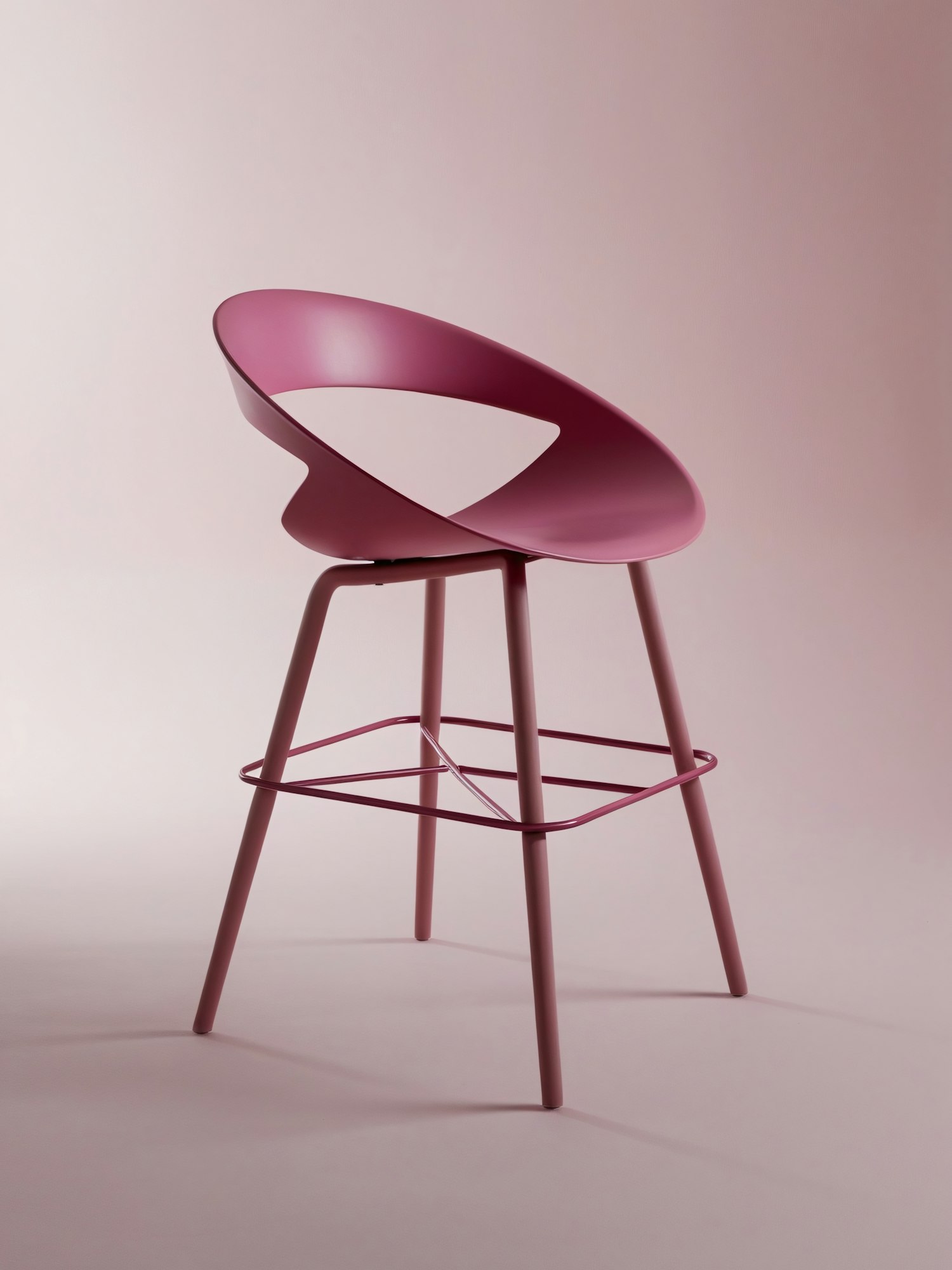 Modern mauve chair with circular open-back design against a soft pink background, showcasing sleek curves and minimalist elegance.