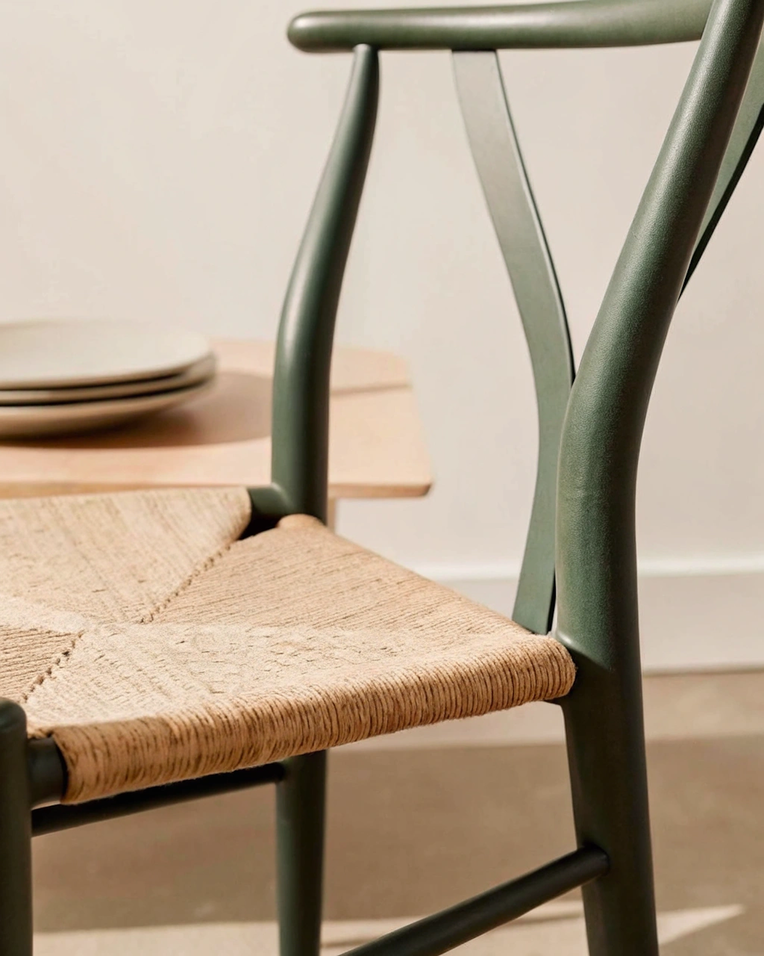 Close-up of a green wooden chair with a woven beige seat, paired with a light wooden table and stacked white plates in soft lighting.