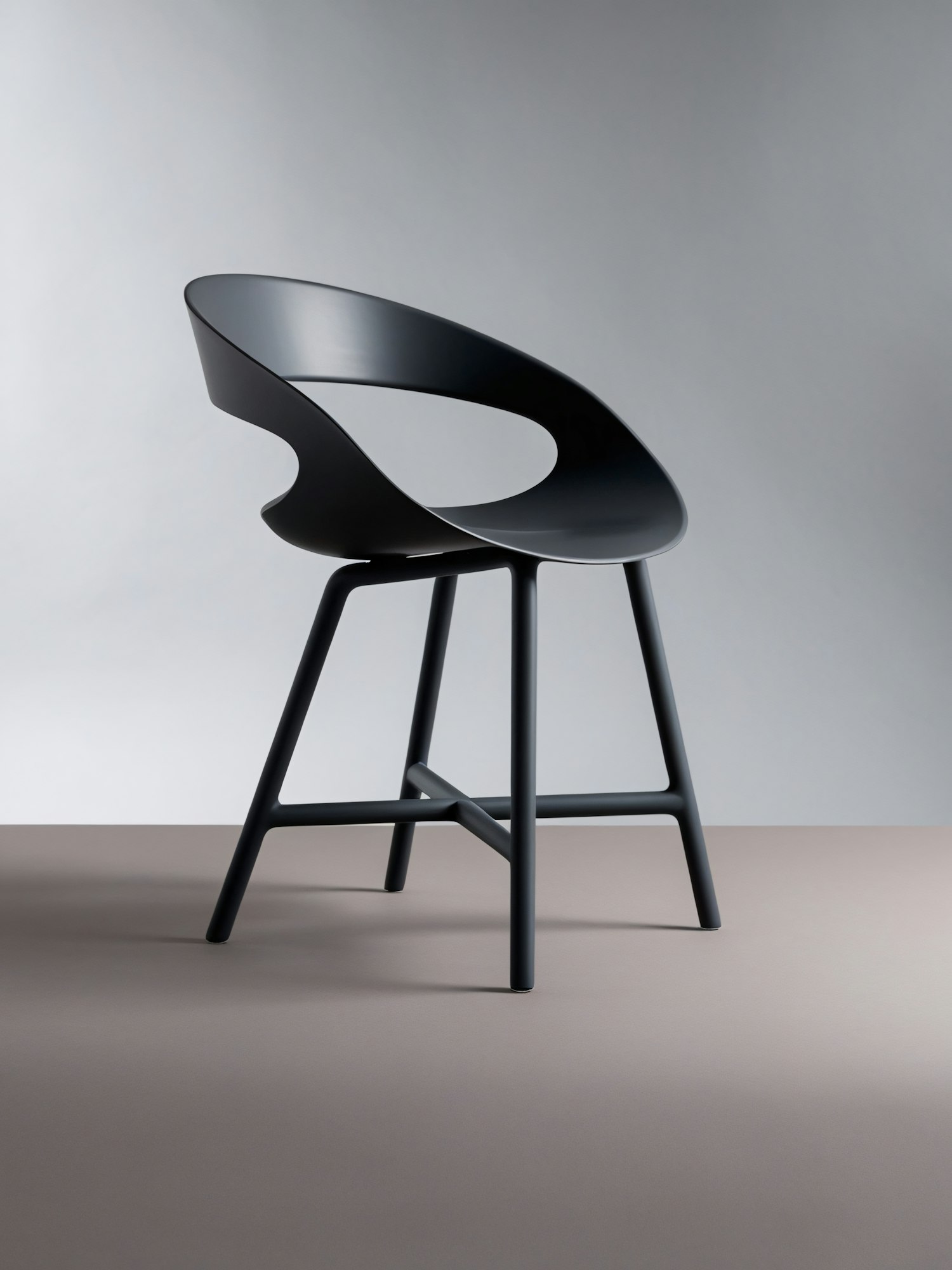Sleek modern chair with a minimalist design, featuring a dark gray finish and unique open-back style against a neutral background.
