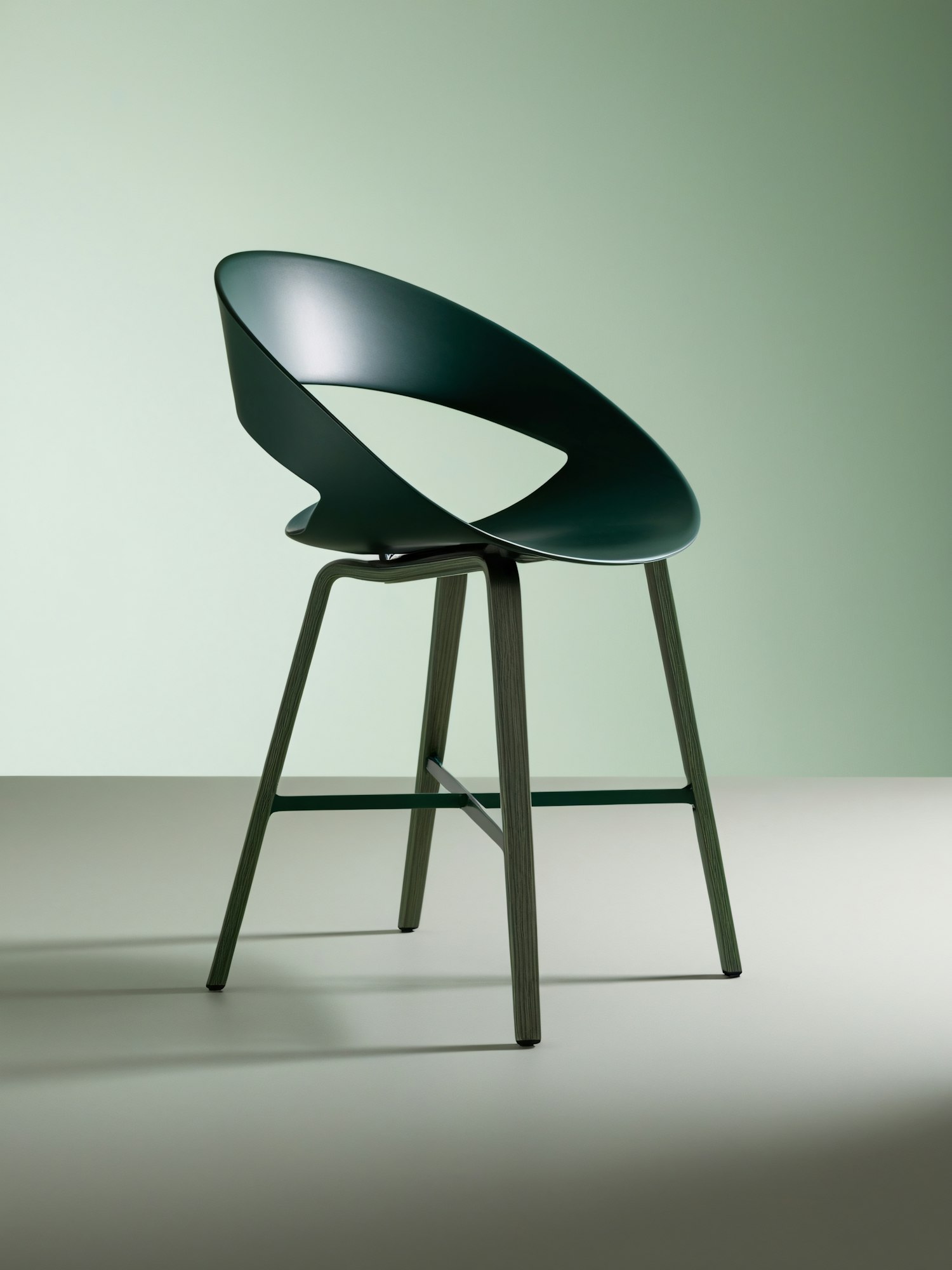 Sleek modern chair with dark green curved backrest and light wood legs against a soft green background. Minimalist and elegant design.