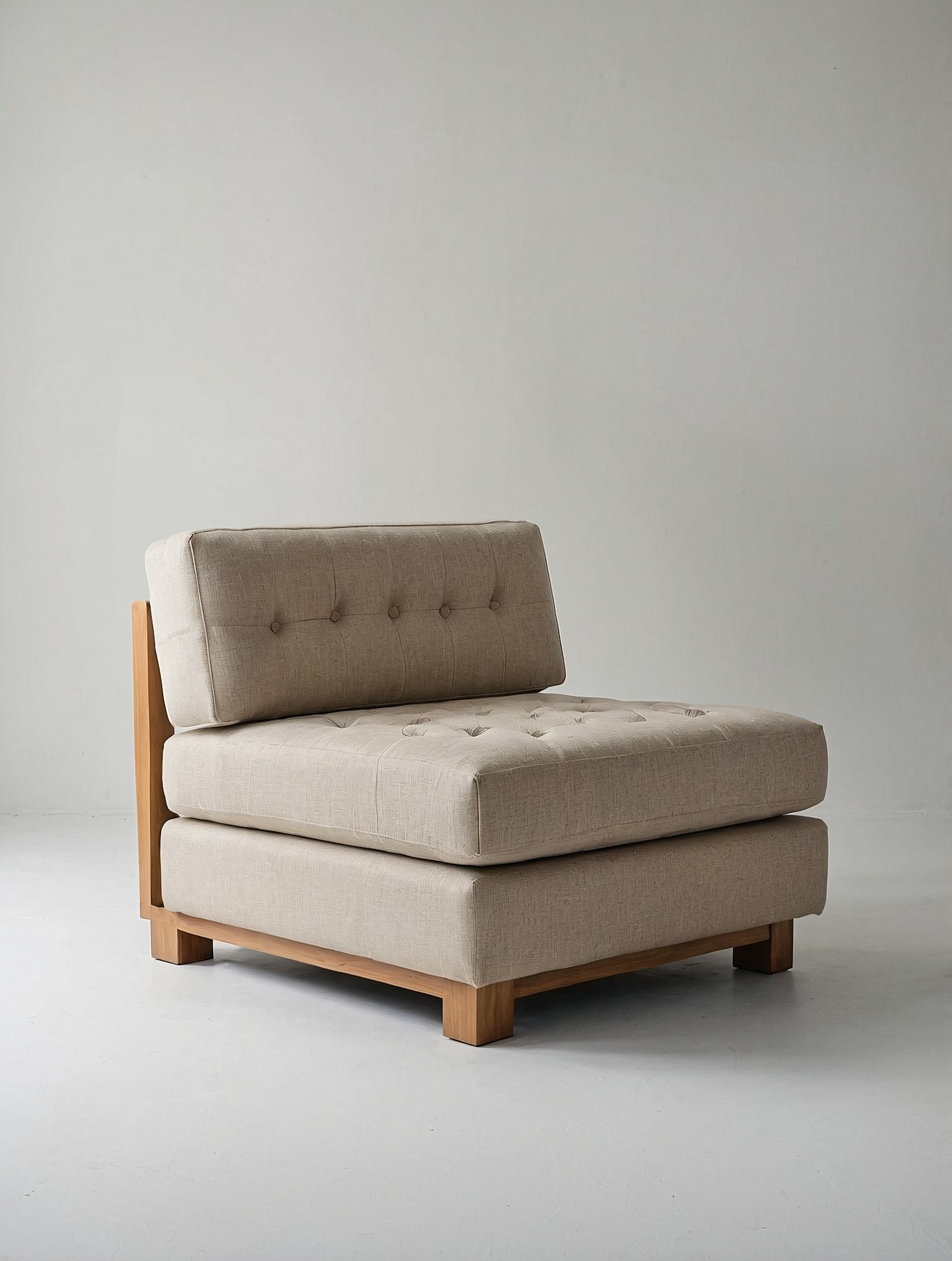 Minimalist beige tufted armchair with a wooden frame, perfect for modern interiors. Neutral tones and clean lines for versatile decor.
