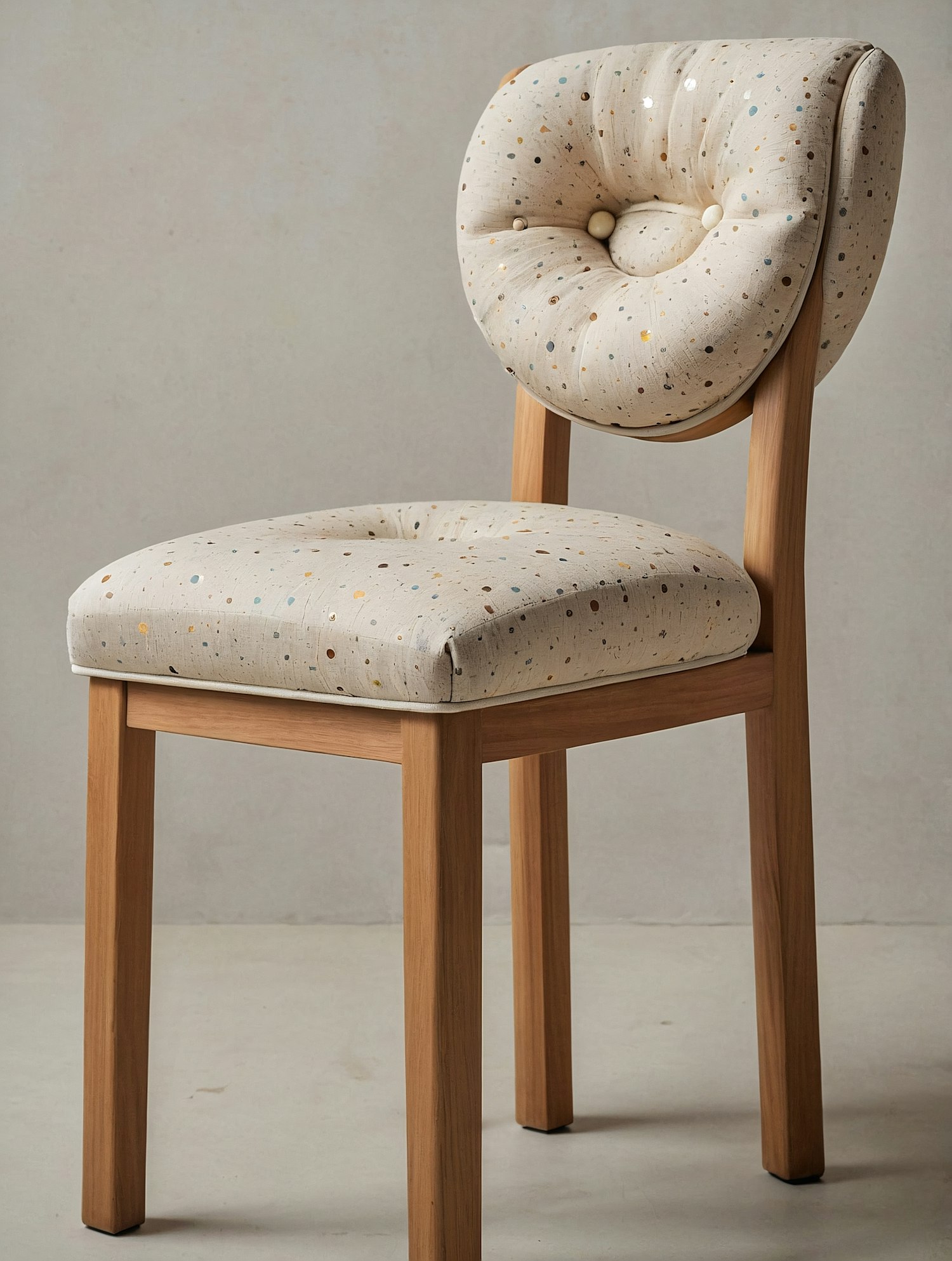 Modern wooden chair with cream speckled upholstery and tufted backrest, perfect for contemporary interiors.