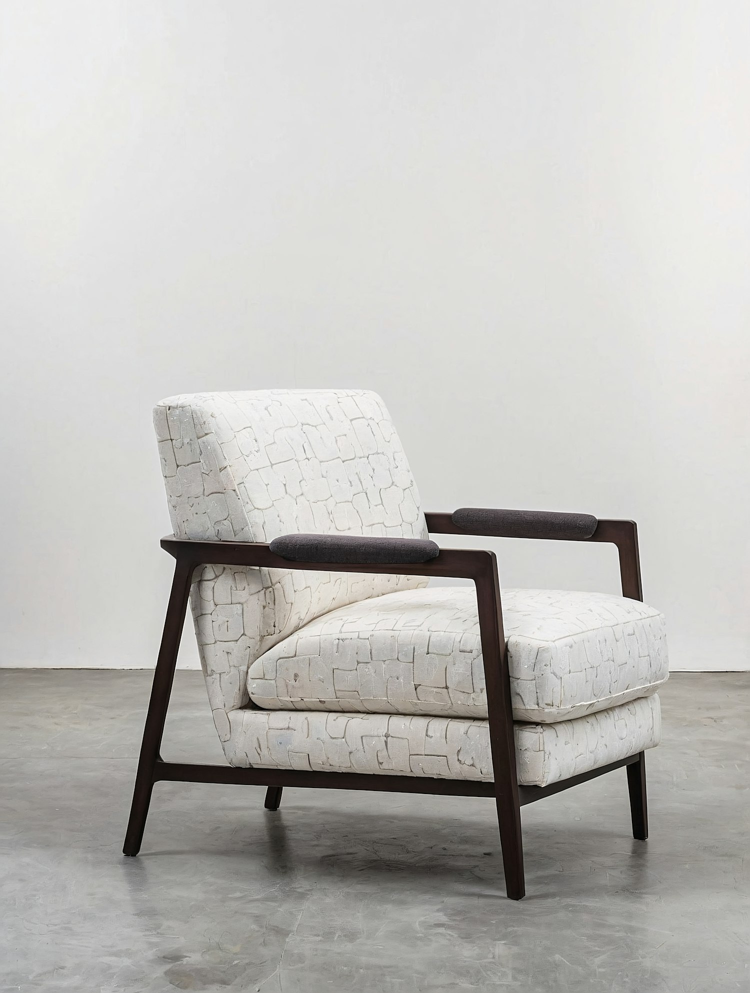 Stylish mid-century modern armchair with dark wood frame, beige patterned upholstery, and gray padded armrests on a concrete floor.