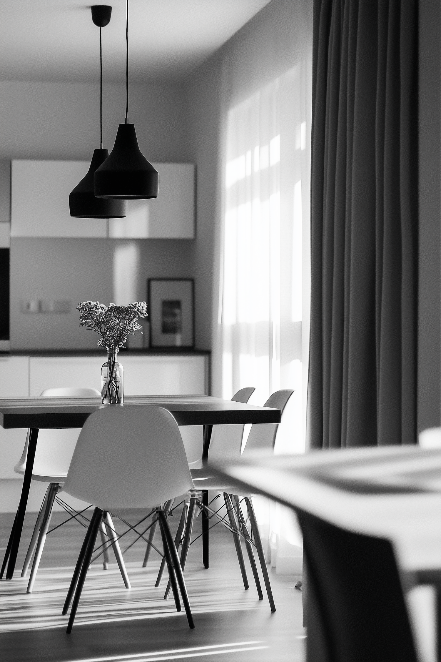 Modern dining room with black table, white chairs, pendant lights, and natural light from large windows.
