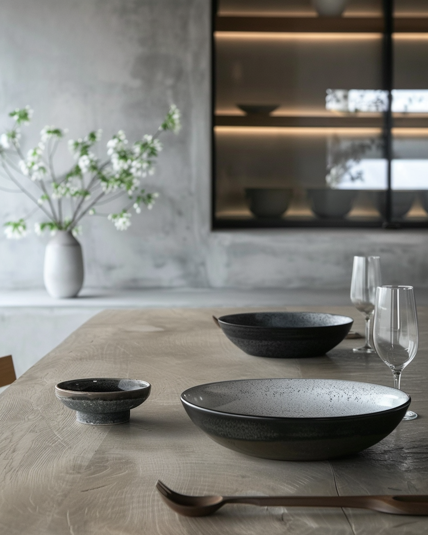 Minimalist dining setup with ceramic bowls, wine glasses, and a wooden spoon on a natural wood table. Elegant and serene ambiance.