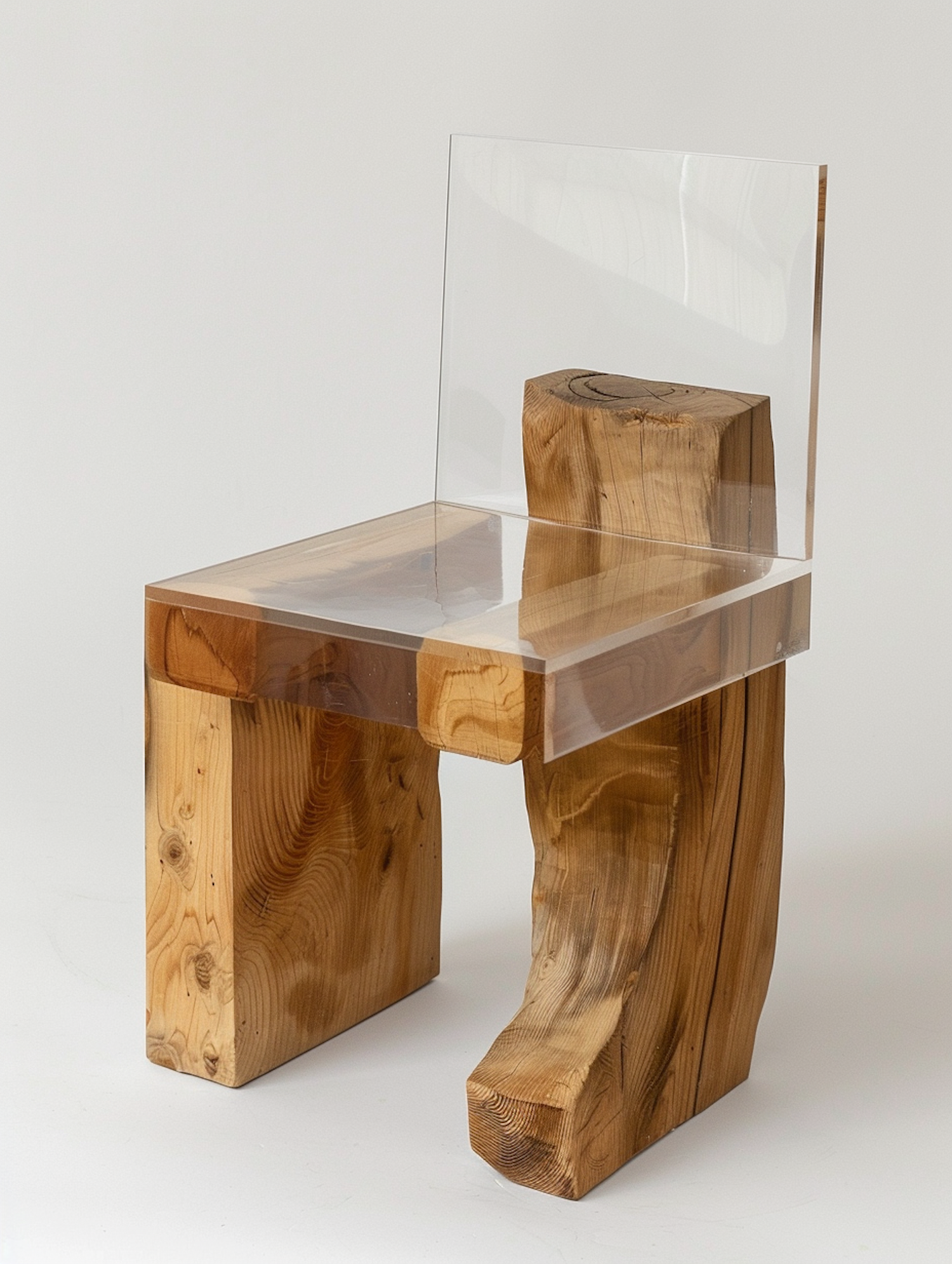 Modern chair with a rustic wooden base and clear acrylic seat and backrest, blending natural and contemporary design elements.