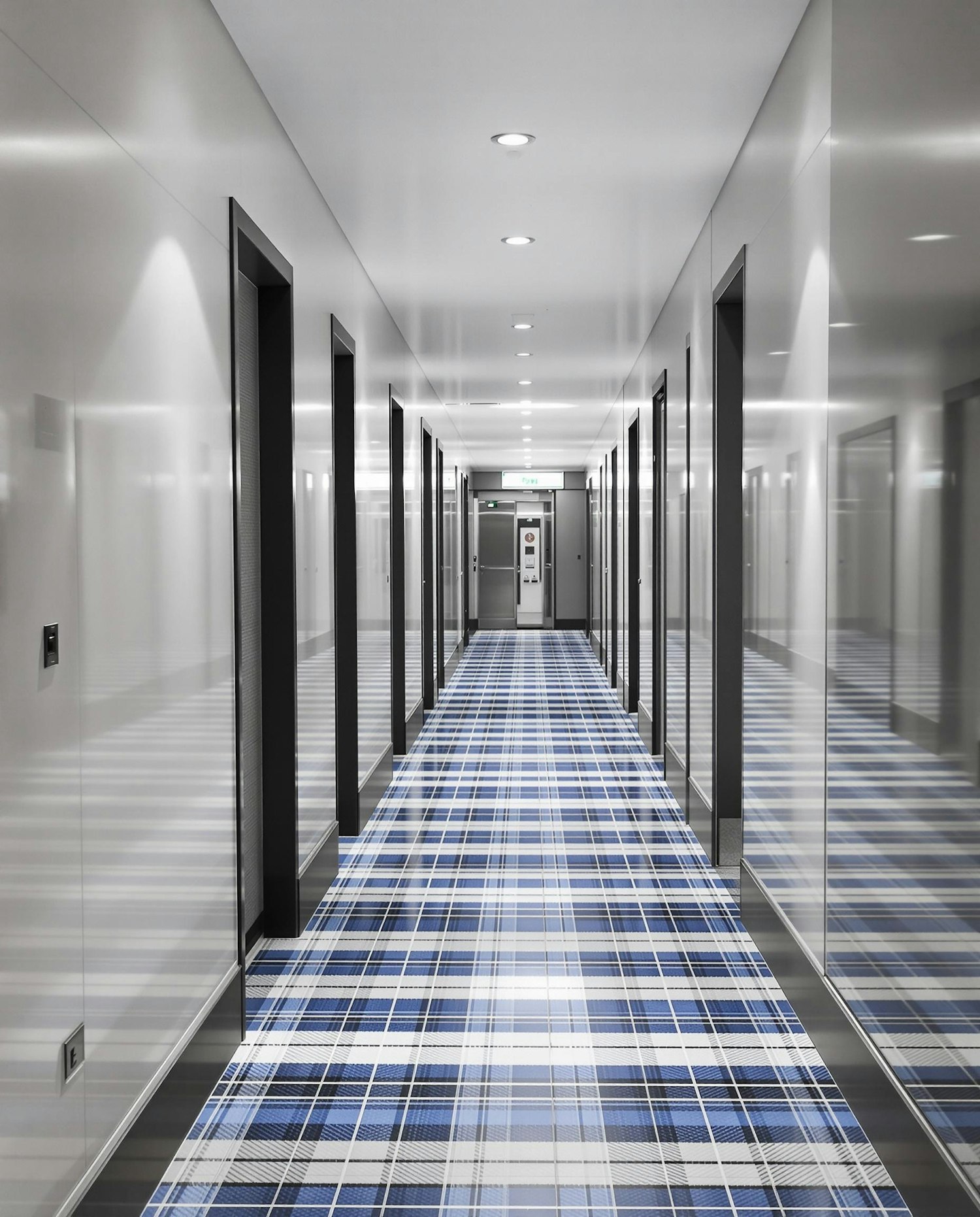 Modern hallway with floor-to-ceiling tartan tile pattern in monochrome blue. Graphic and bold, with strong overhead lighting.