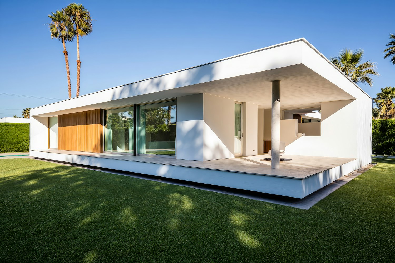 Modern minimalist house with white walls, large glass windows, and wooden accents, surrounded by a lush green lawn and palm trees.
