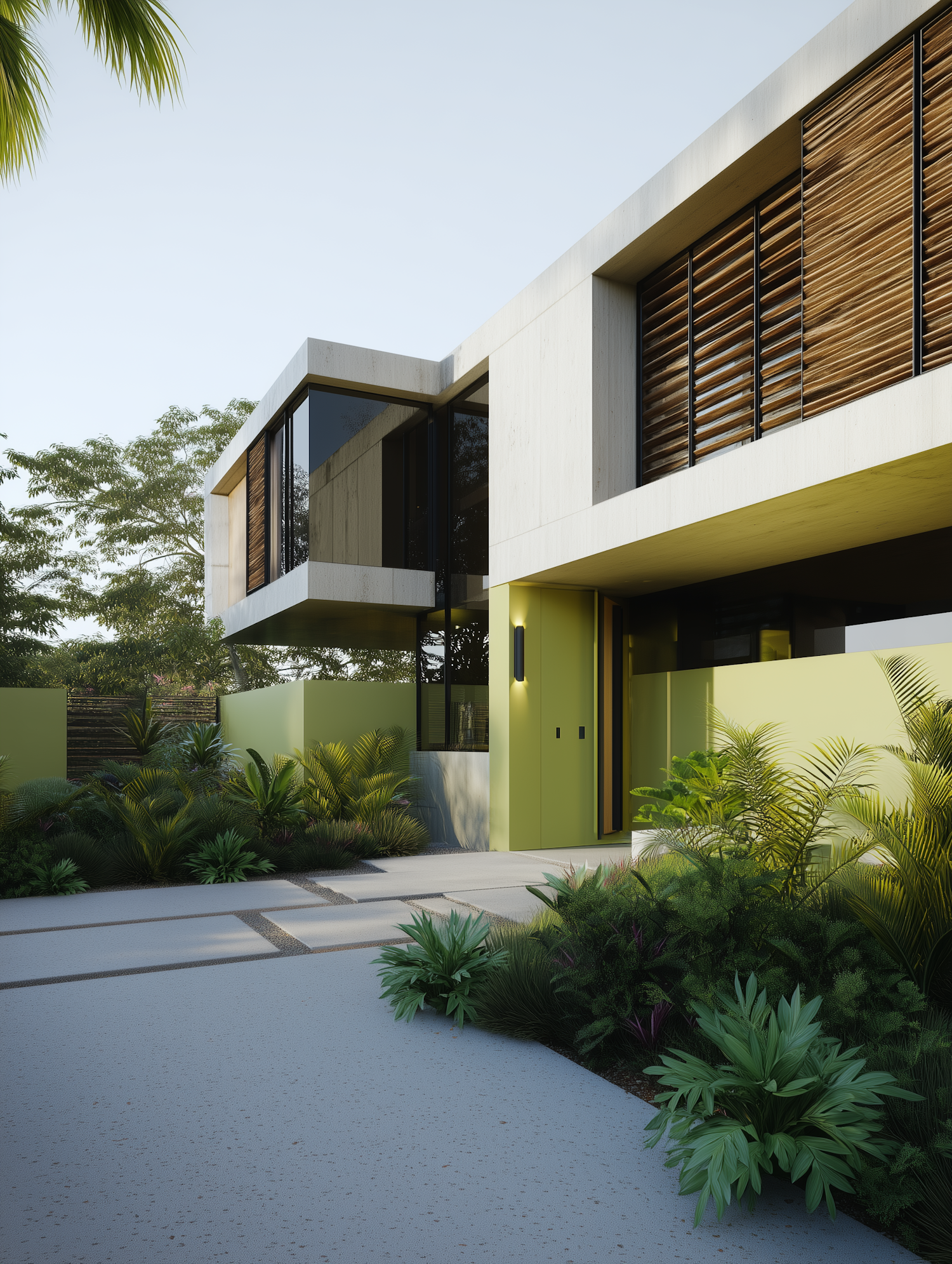 Modern two-story house with lime-green accents, wooden shutters, and lush tropical landscaping. Sleek driveway and minimalist design.