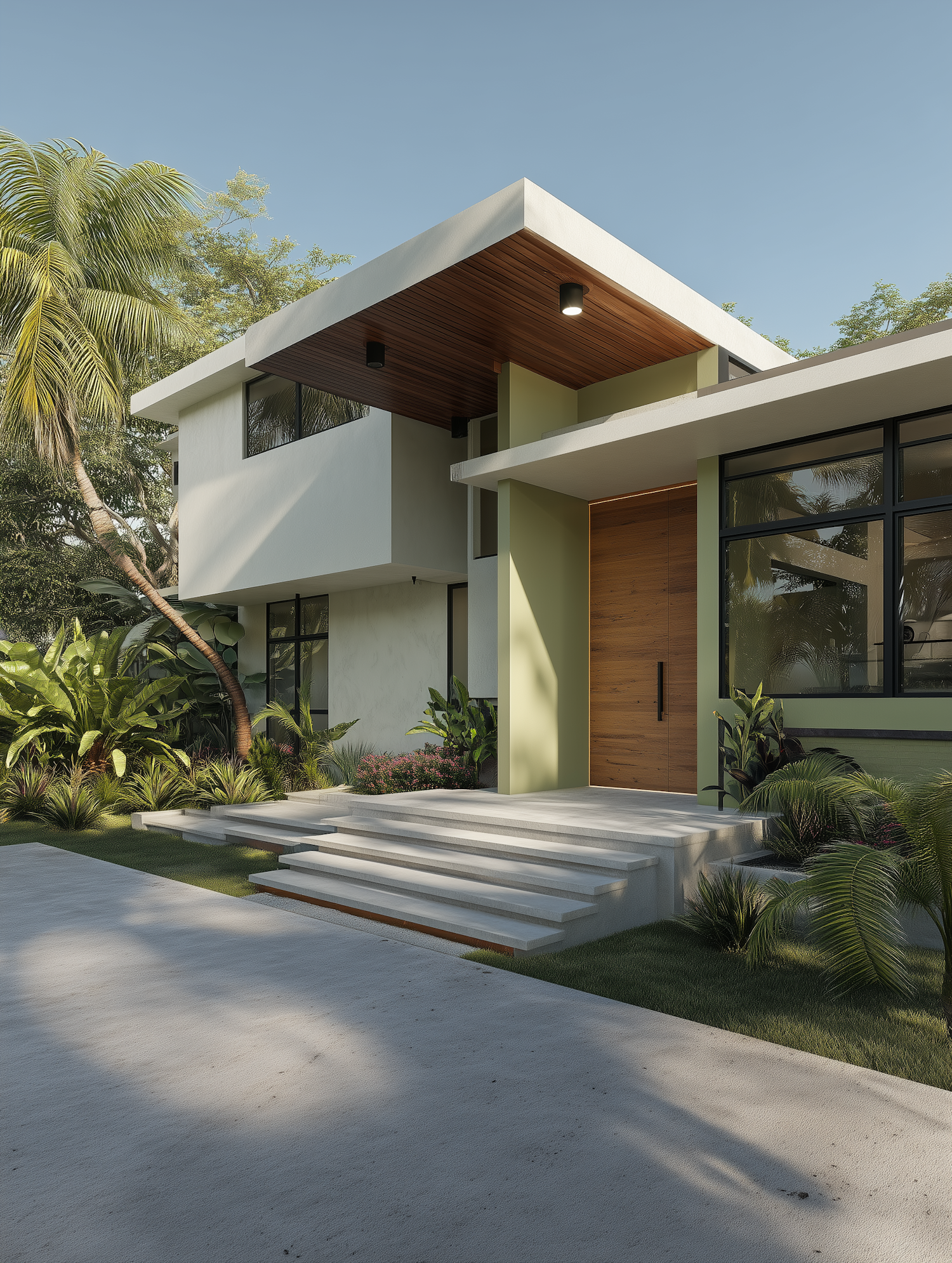 Modern minimalist house with tropical landscaping, flat roof, wooden accents, and large windows. Floating steps lead to a sleek entrance.