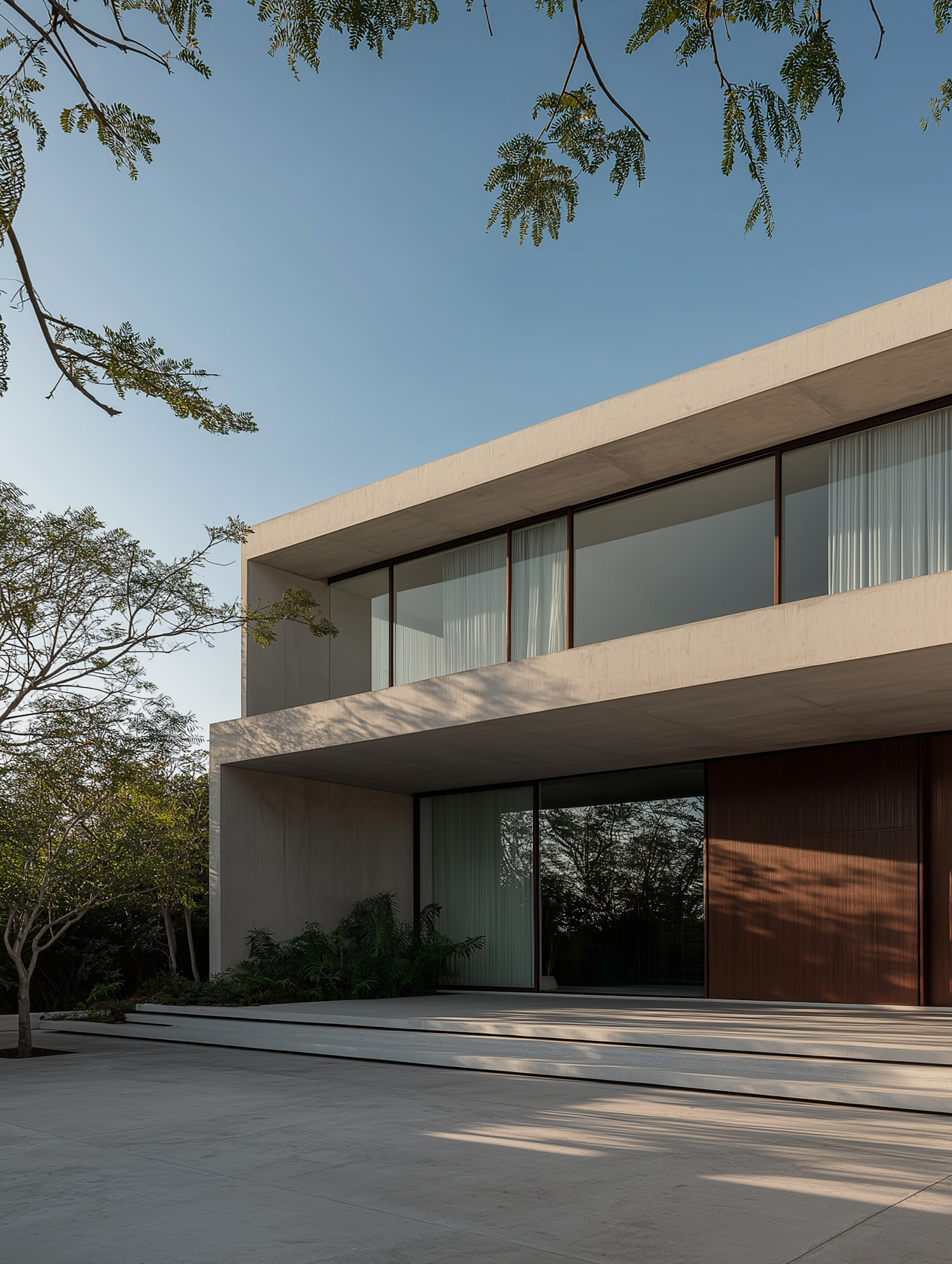 Modern minimalist house with large glass windows, wooden accents, and lush greenery under a clear blue sky.