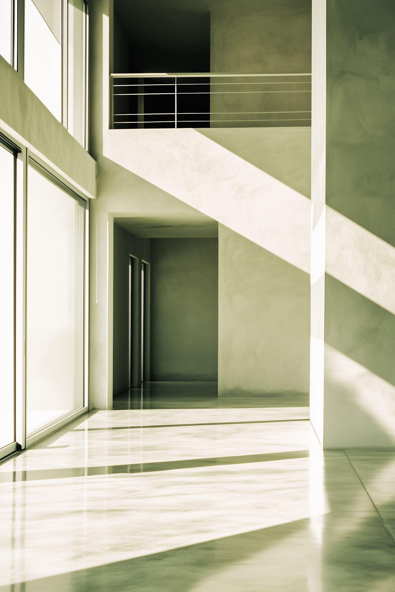 Minimalist interior with large windows, polished floors, and angular sunlight shadows. A mezzanine with sleek railings adds a modern touch.