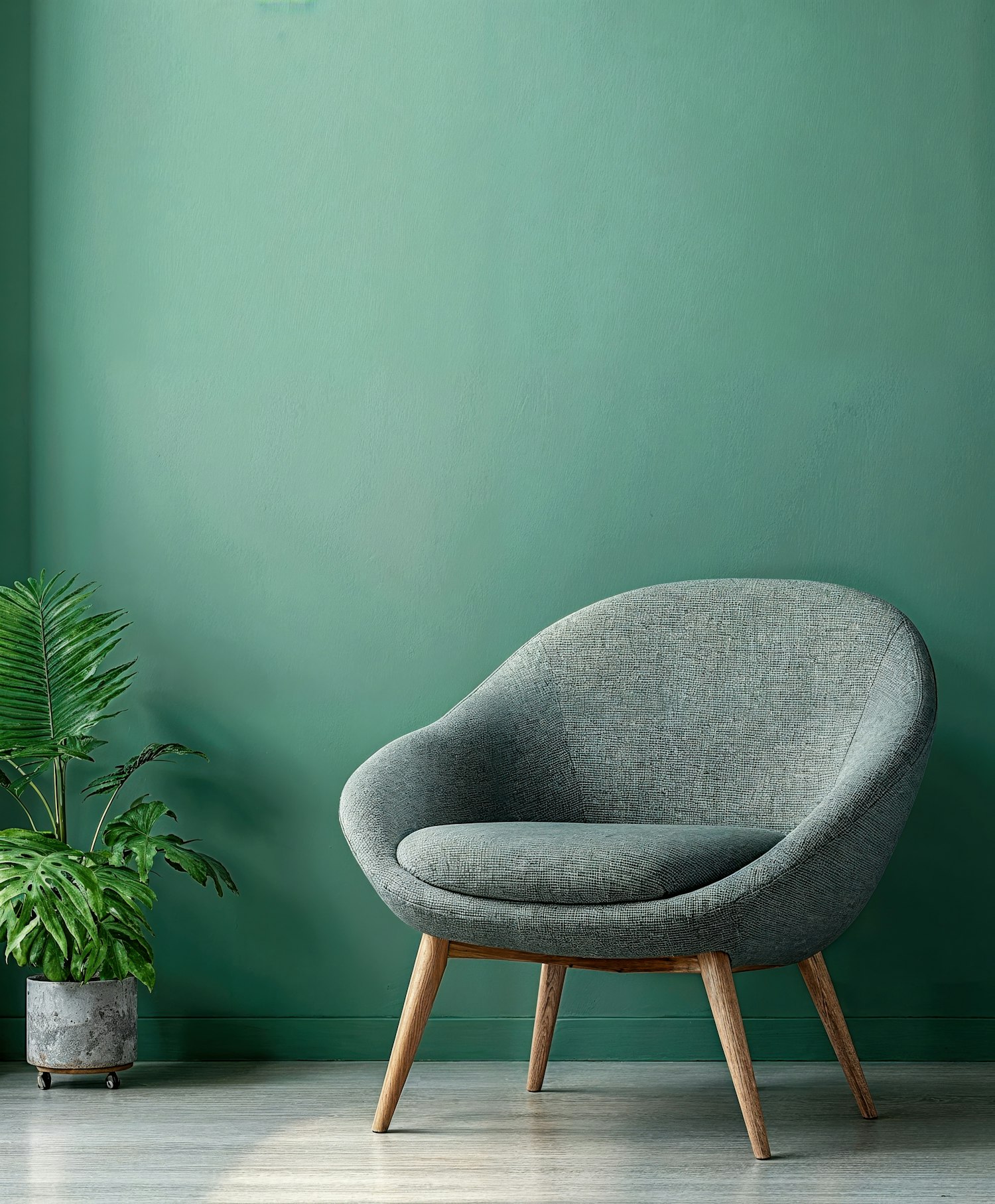 Modern armchair with wooden legs against a green wall, paired with a lush potted plant on a light wood floor.