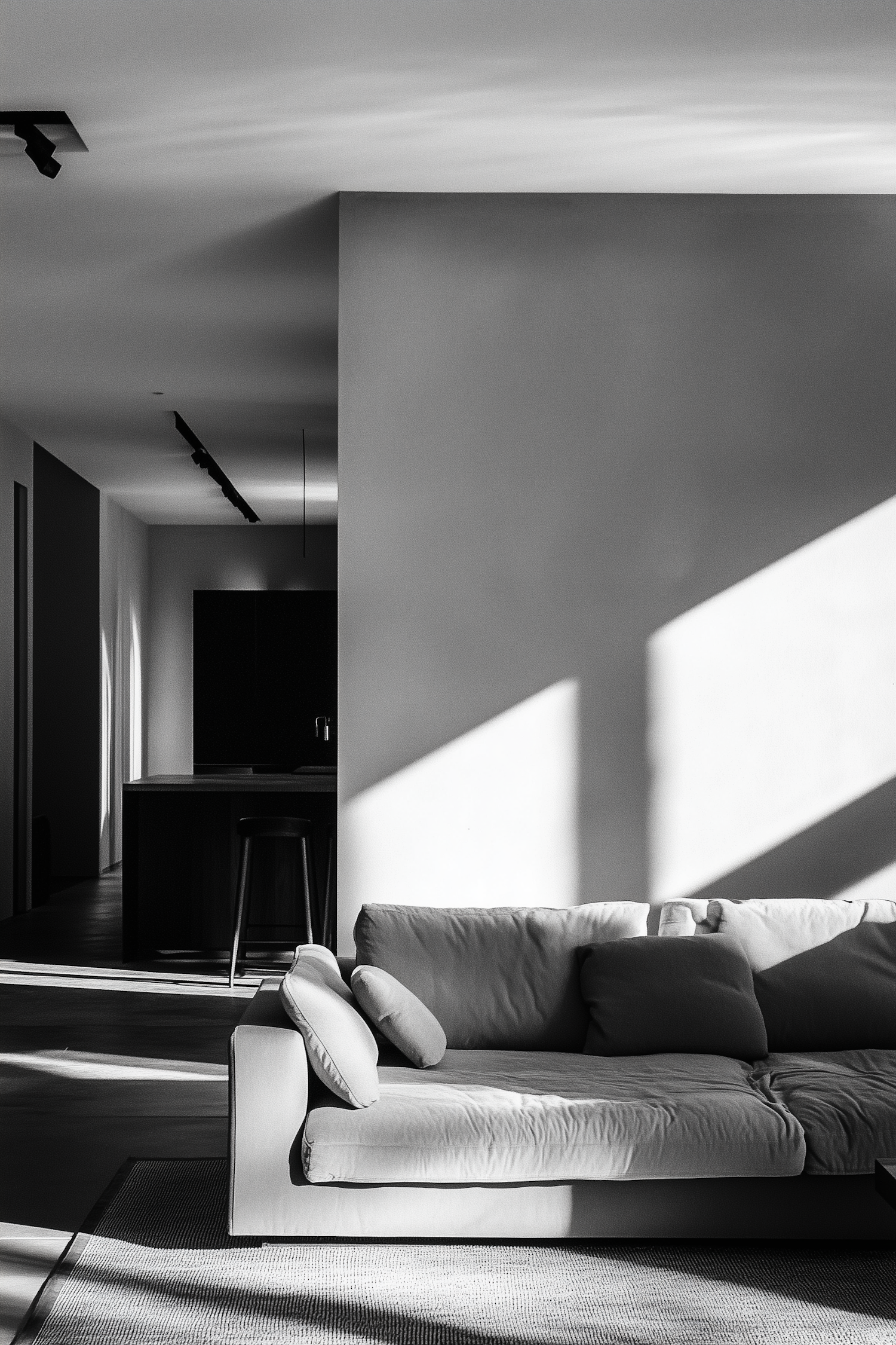 Minimalist living room with a cozy sofa, natural light, and sleek kitchen. Modern design with clean lines and neutral tones.