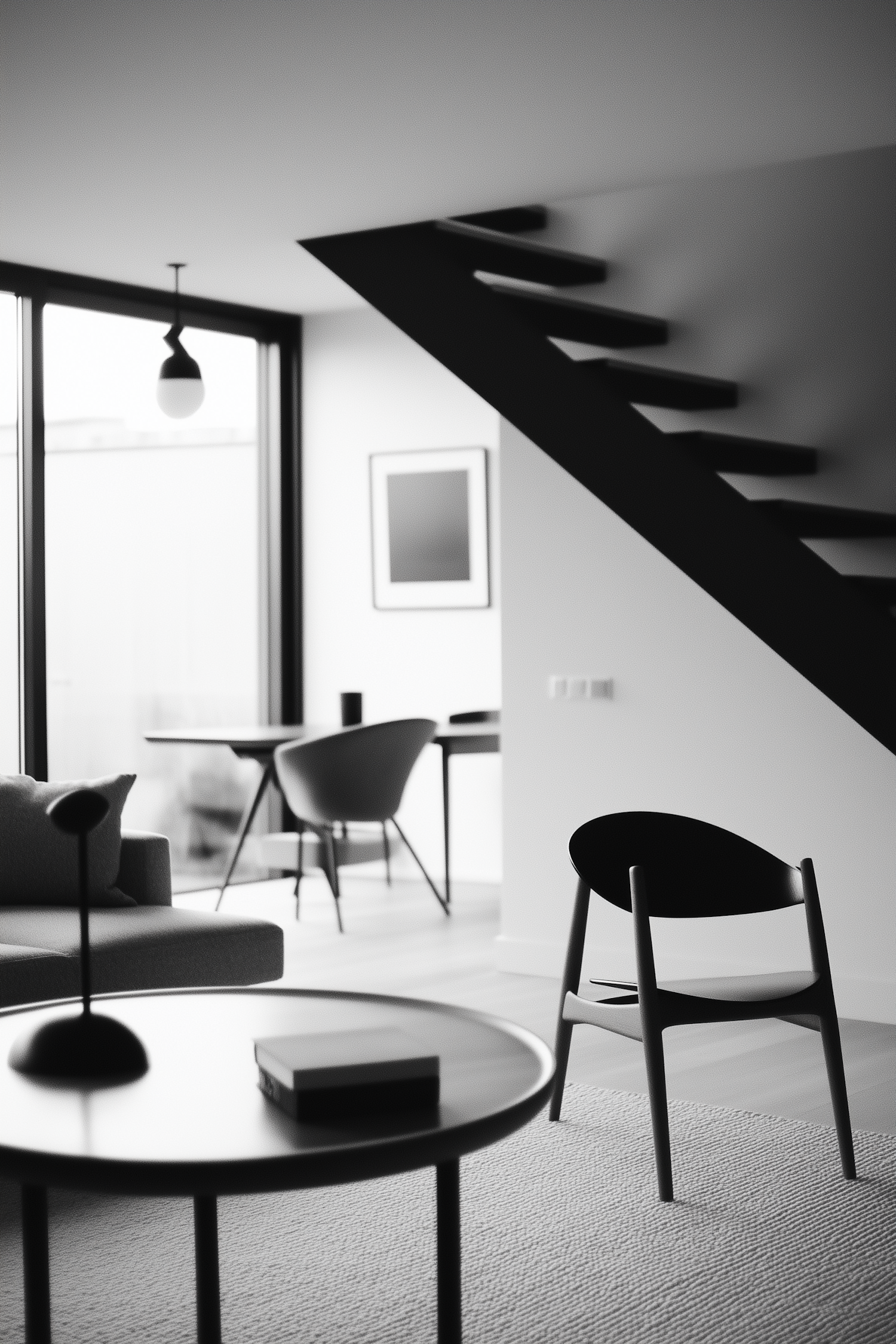 Minimalist living room with black staircase, round coffee table, and dining area. Monochrome palette enhances modern elegance.