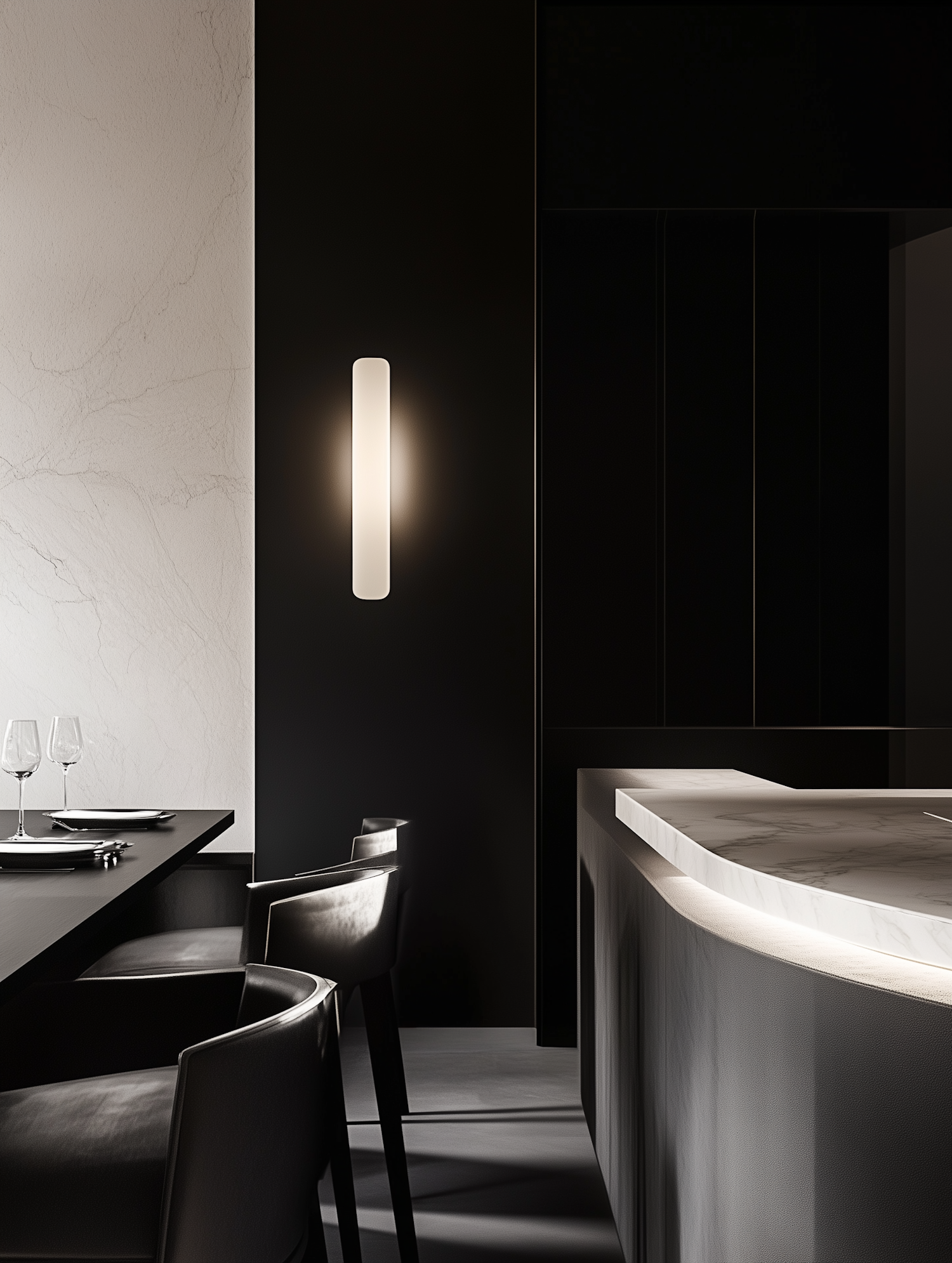 Modern minimalist kitchen with black and marble design, featuring sleek furniture and ambient lighting for a sophisticated look.