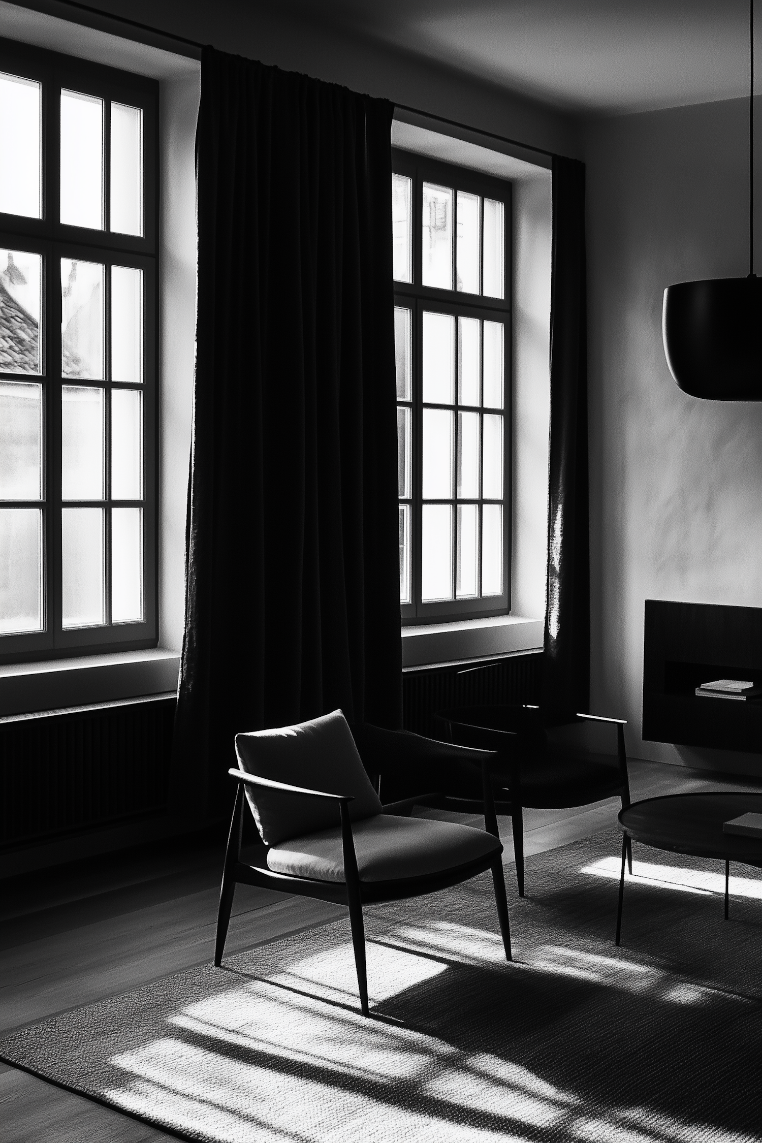 Minimalist living room with modern chairs, large windows, and soft lighting. Elegant and serene interior design.
