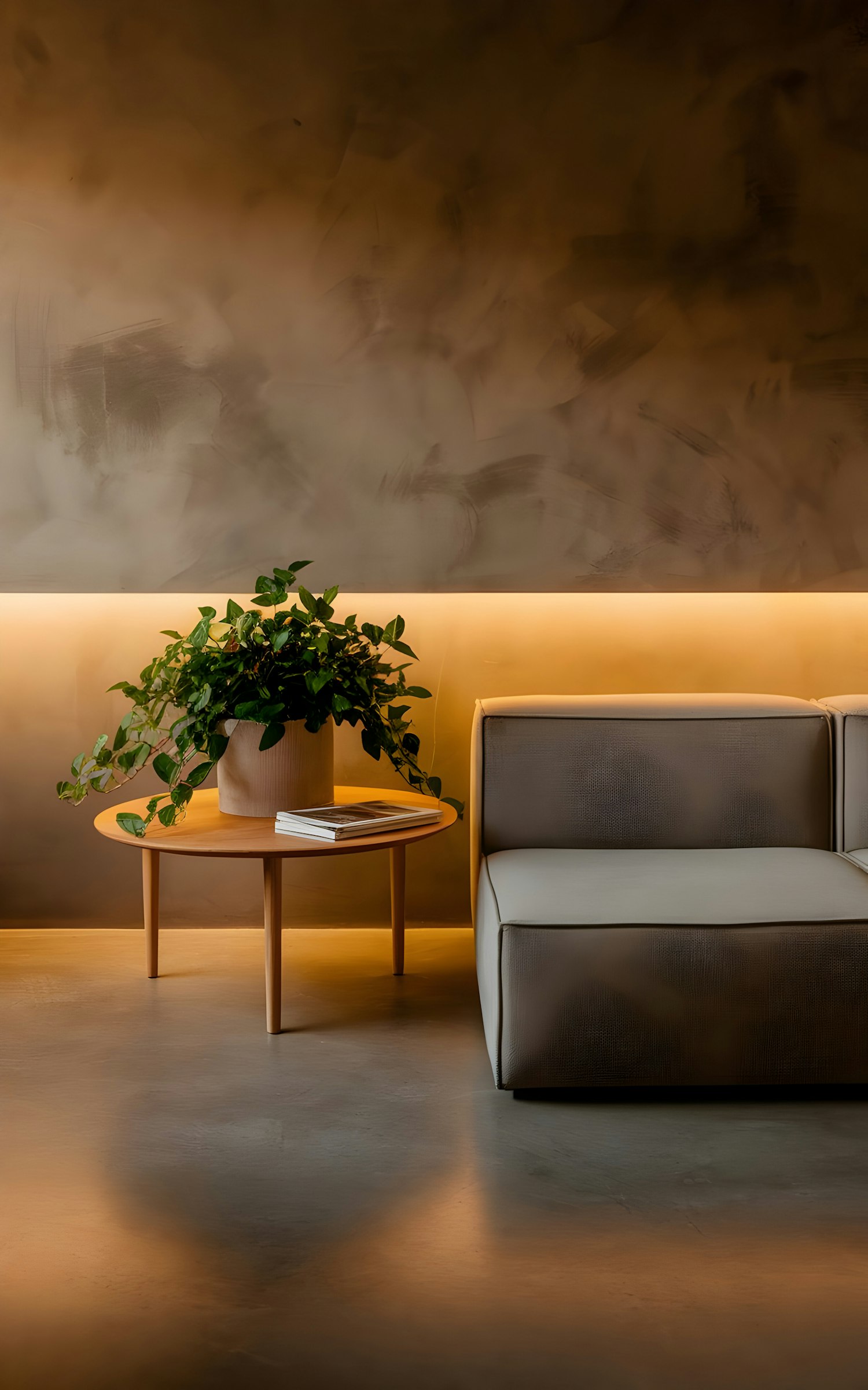 Minimalist interior with a gray sofa, wooden table, potted plant, and warm lighting against a textured brown wall.