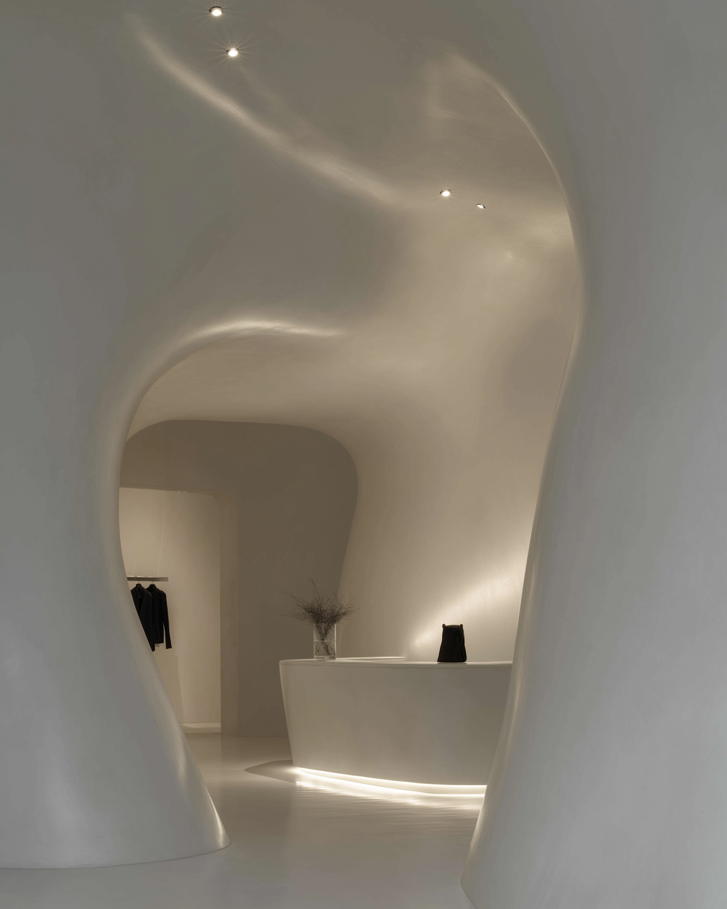 Minimalist interior with flowing, organic architecture, a sleek reception desk, and warm lighting for a serene, futuristic ambiance.